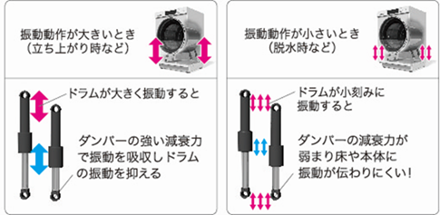 高速脱水時の細かな振動が洗濯機本体や床に伝わりにくい設計です。また、衣類が偏った際の揺れも軽減し、安定した運転を実現します。