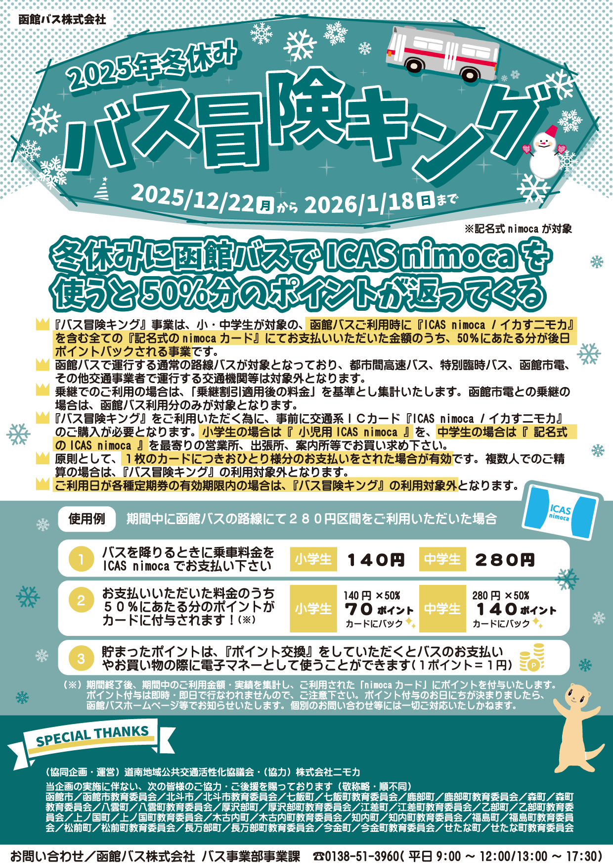 函館バス(株)・道南地域公共交通活性化協議会では、地域公共交通の維持確保に向けた取組の一環として、次世代の利用者拡大を図るため、12月22日(月)~1月18日(日)の冬休み期間中、小中学生が記名式のnimocaカードを使用し、路線バス乗車料金を支払った場合、乗車料金の半額分をポイントバックする「バス冒険キング」を次のとおり実施します!