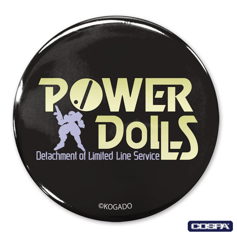 「POWER DoLLS」のロゴが直径65mmの大きめ缶バッジに。