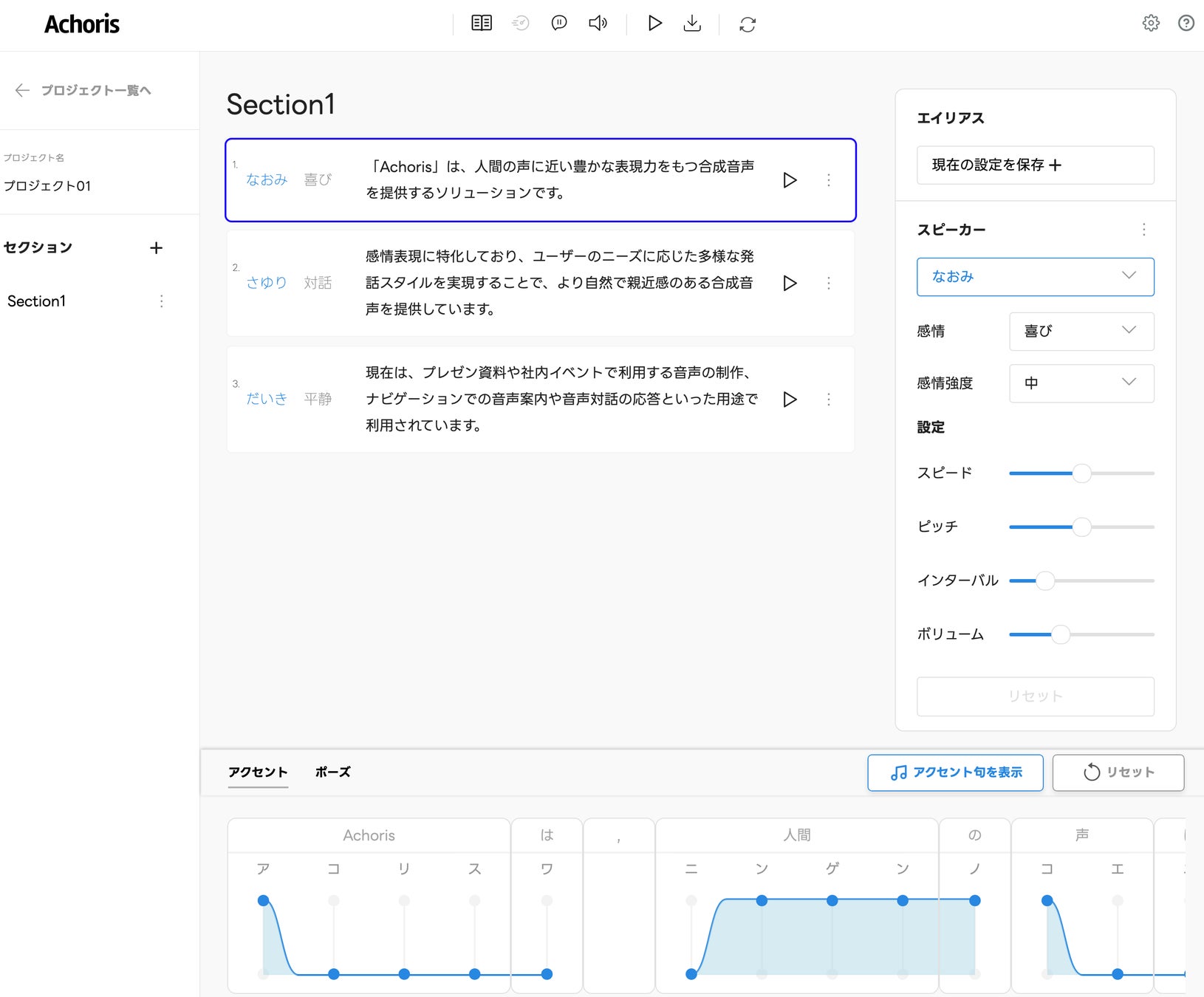 ・画面上で、話者・感情スタイル・スピード・ピッチなどを直感的に調整可能