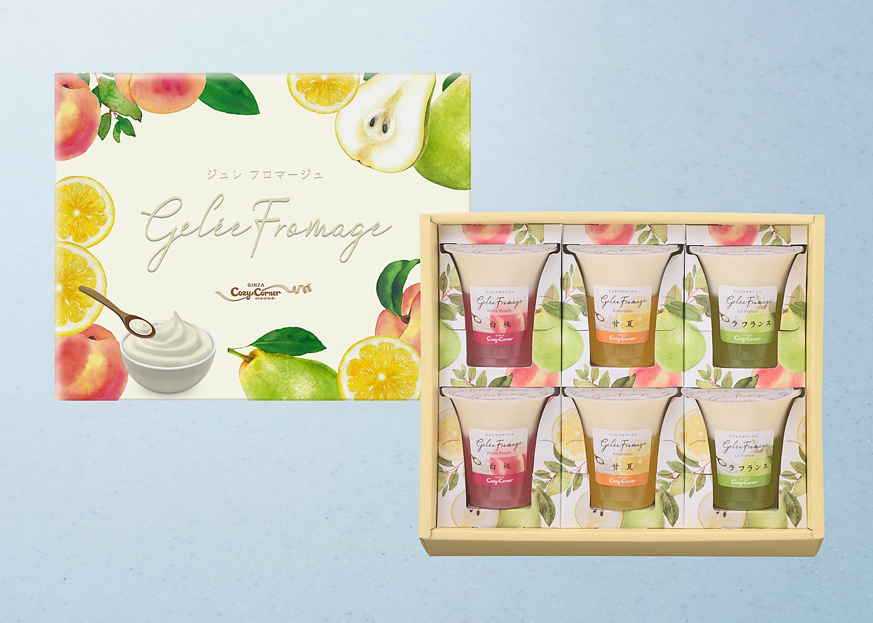 デンマーク産とオーストラリア産の2種のクリームチーズをブレンドして、豊かなコクがありながらさっぱりとした後味のチーズムース。国産果汁やピューレを使用して、フルーティなおいしさをギュっととじ込めたゼリー。ゼリーとチーズムースを重ねて、パルフェのように仕立てました。上品な香りと甘みが広がる「白桃」、すっきりとした甘み&ほろ苦さあふれる「甘夏」、高貴な香り&甘みが広がる「ラ フランス」。フルーツとチーズが織りなす爽やかなマリアージュをお楽しみください。