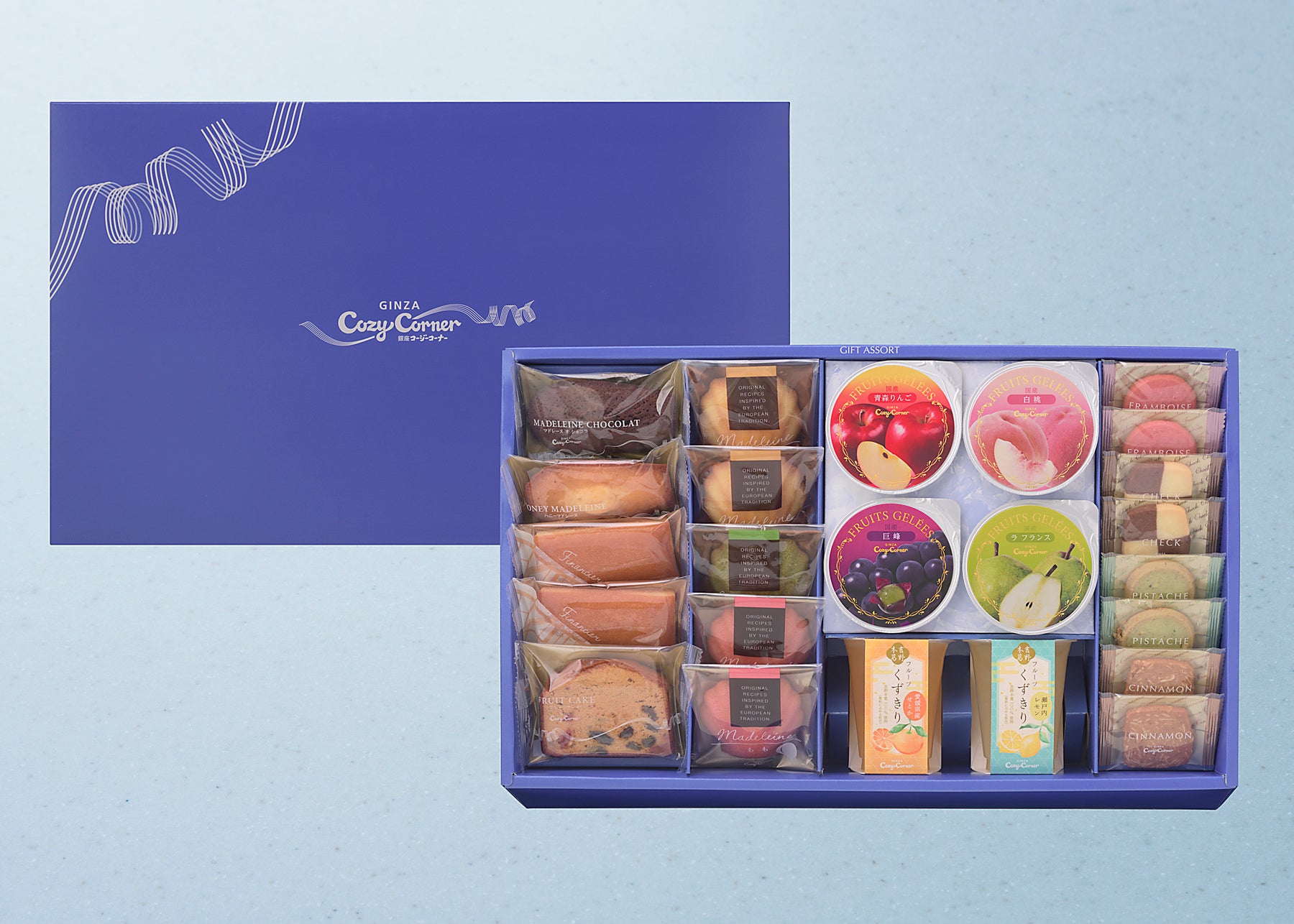 巨峰、ラ フランス、りんご、白桃。国産果汁を使用して、フルーティなおいしさをギュッととじ込めた口あたりなめらかなゼリー「フリュイジュレ」。吉野本葛を使用したくずきりと、国産果汁入りシロップを一緒にいただく和スイーツ「フルーツくずきり」。厳選した素材の味を引き立て、風味豊かに焼き上げたマドレーヌやフィナンシェ、クッキー、フルーツケーキ。みずみずしい果実の味わいを楽しめるゼリーやくずきりと、焼菓子をバラエティ豊かにアソートしました。