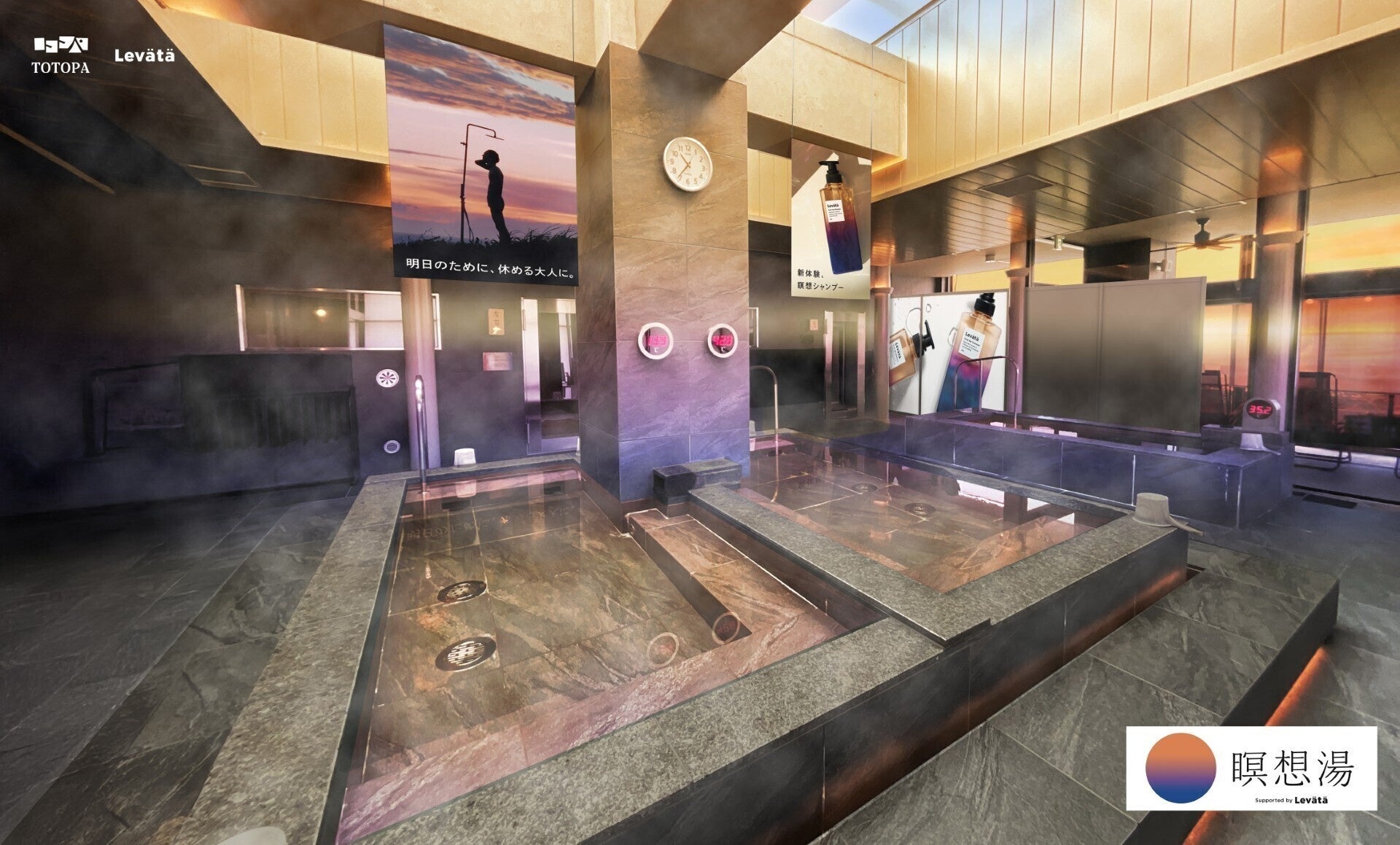 マンダムが展開する“瞑想シャンプー” Levätä(レバタ)は、そんな思いから地肌がほぐれることで心も頭もいやされる新感覚を体験できるイベント【瞑想湯 supported by Levätä】を都市型スパTOTOPA(トトパ)で開催します。会場全体で感じられるLevätäの世界観や本イベントでしか体験できない様々な限定企画を通じて、 Levätäの魅力を五感でお楽しみください。