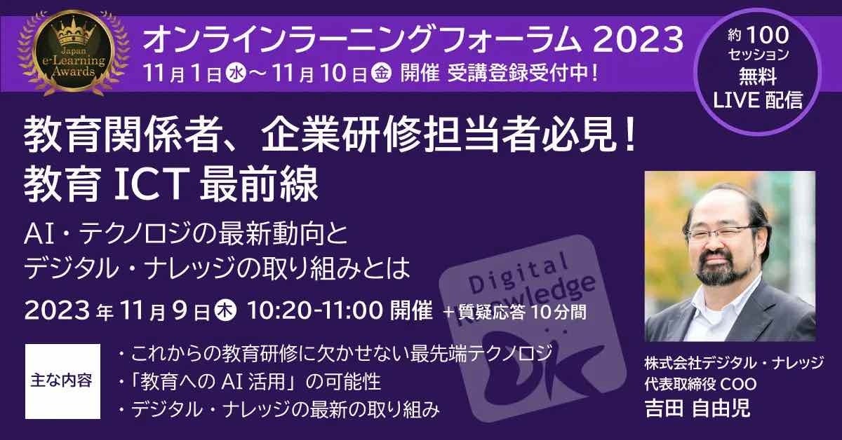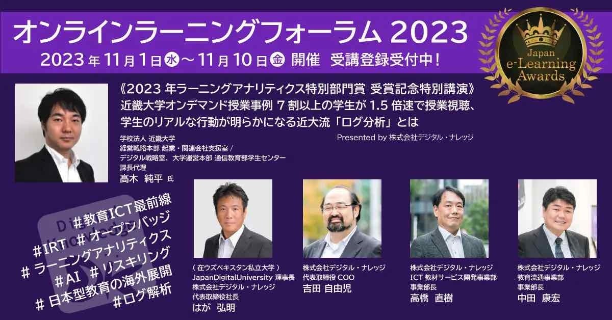 デジタル・ナレッジは、【2023年ラーニングアナリティクス特別部門賞】受賞の近畿大学様も含め、5講演、6回の登壇を予定しております。