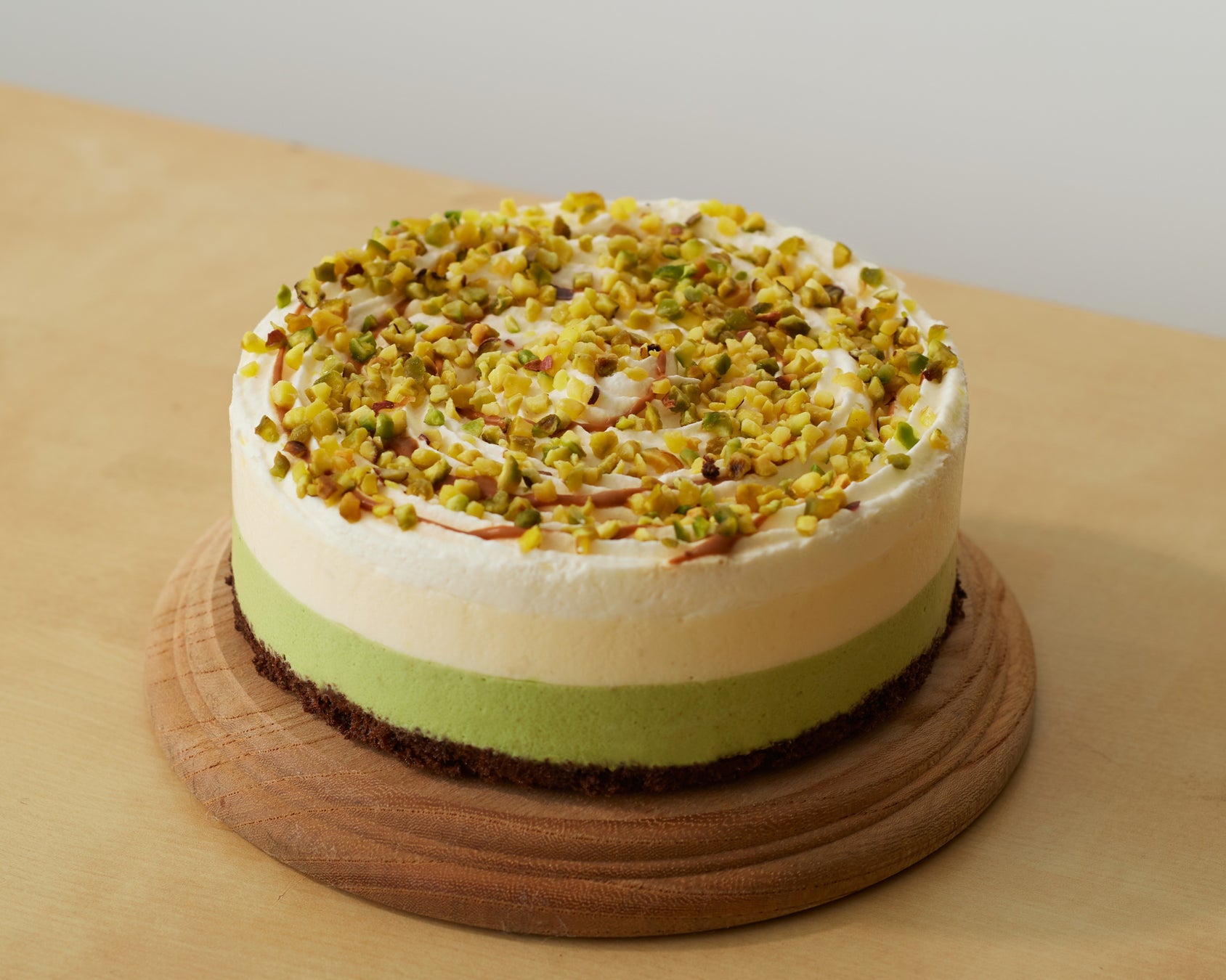 香り豊かなピスタチオムースとマスカルポーネムースは、コク深い味わいをお楽しみいただけます。中心にはフランボワーズシロップを染み込ませたジェノワーズを忍ばせ、爽やかな酸味で夏でもさっぱりとした後味を。天面にはキャラメルソースとピスタチオを散らし、食感のアクセントとピスタチオの豊かな風味をしっかりと感じていただけます。