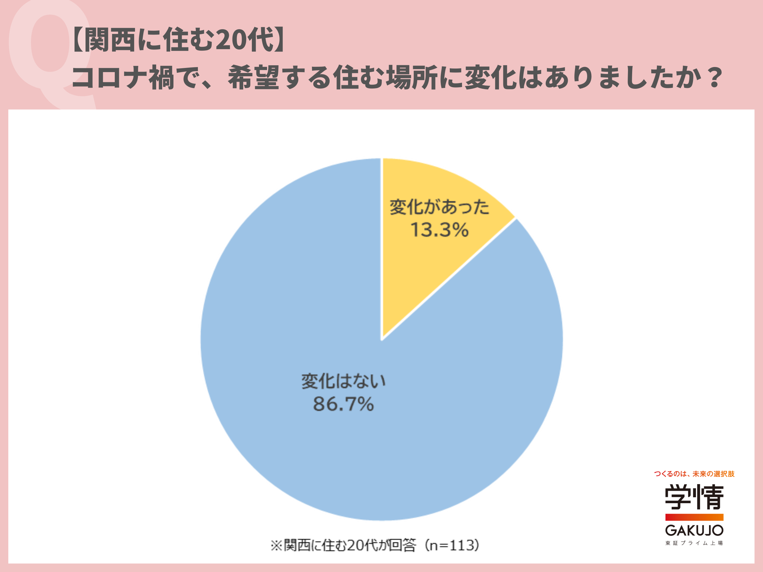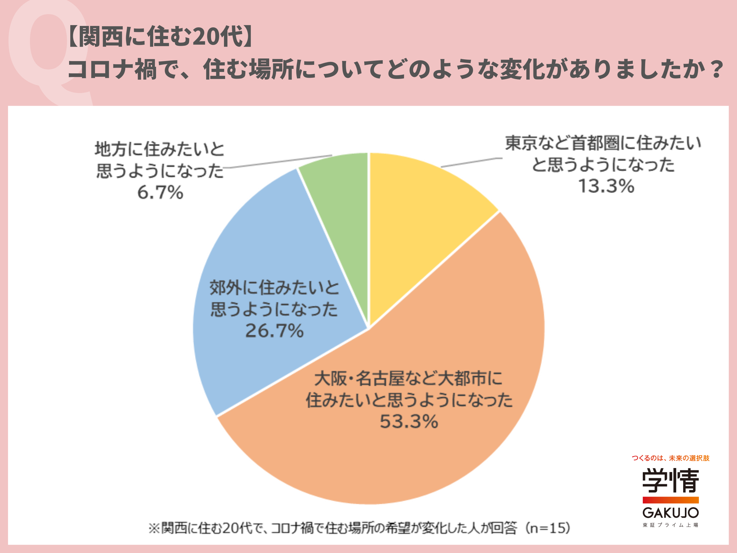 関西に住む20代で、「コロナ禍で、希望する住む場所に変化があった」と回答した割合は13.3%でした。「変化した」と回答した割合は、一都三県や、地方に住む20代と比較すると最も低くなりました。変化した内容は「大阪・名古屋など大都市に住みたいと思うようになった」53.3%が最多。次いで、「郊外に住みたいと思うようになった」26.7%が続きます。「コロナを理由に住む場所に関する希望は変化しなかった」「東京ほどテレワークの企業が多いわけではないし、地方ほどコロナ禍で行動が制限されているわけではない」といった声が上がっています。