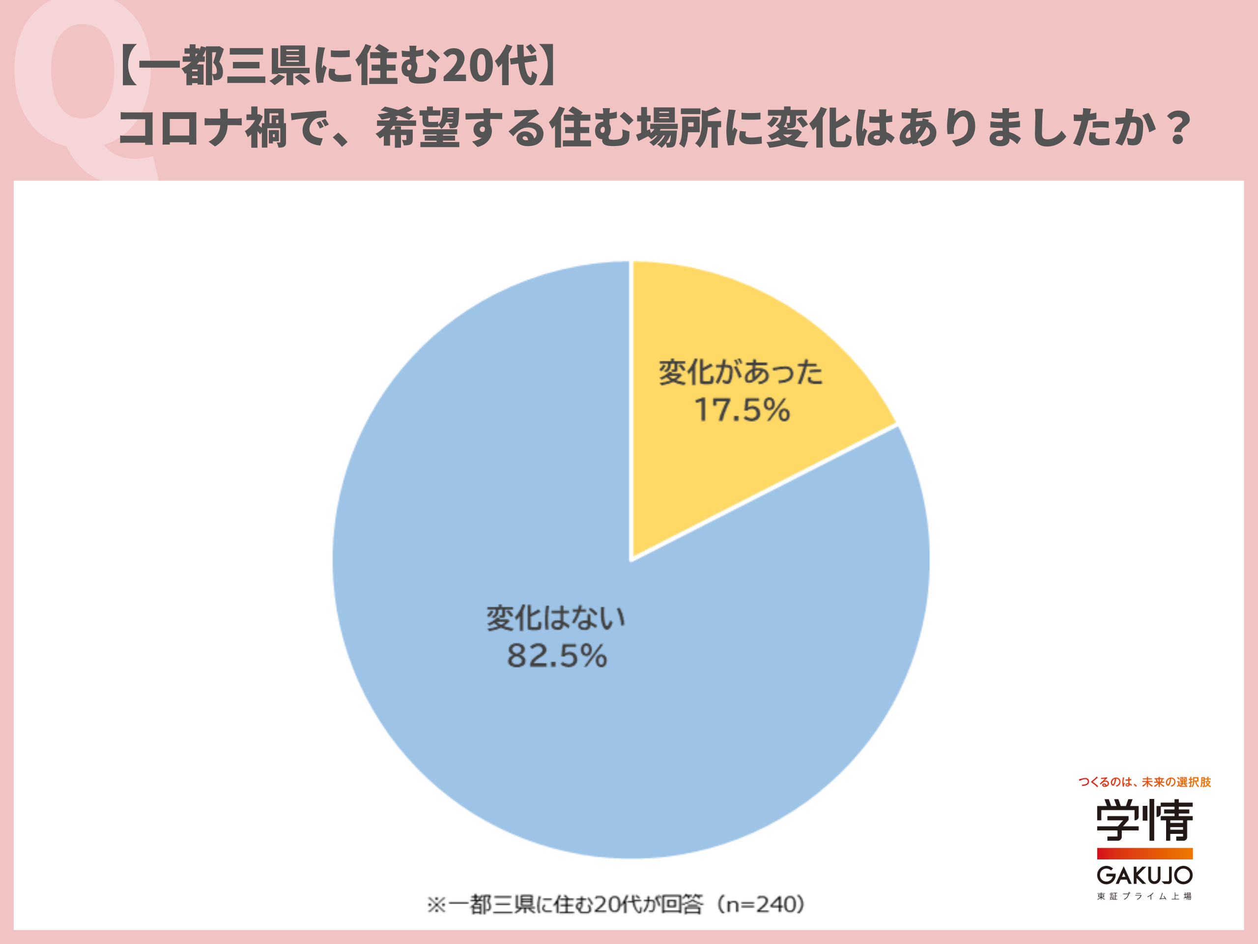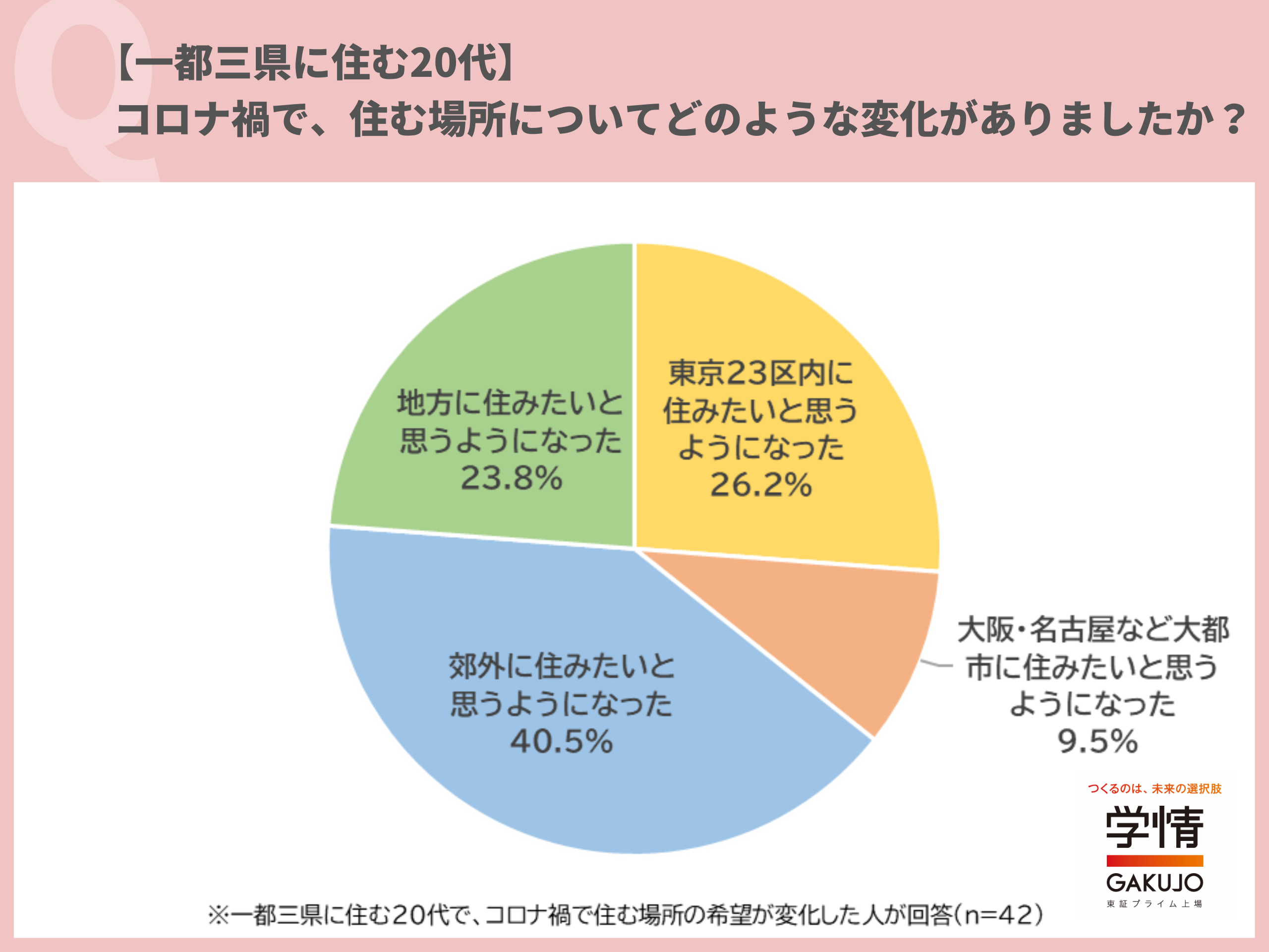 一都三県(東京・神奈川・千葉・埼玉)に住む20代で、「コロナ禍で、希望する住む場所に変化があった」と回答した割合は17.5%でした。変化した内容は「郊外に住みたいと思うようになった」40.5%が最多。次いで、「東京23区内に住みたいと思うようになった」26.2%が続きます。「テレワークが中心なので、都心にも出やすく、広い部屋に住める郊外への引っ越しを検討している」「プライベートでの外出を考えると、都心へのアクセスが良い場所に住みたい」「テレワークを経て通勤時間が大きな時間のロスだと感じ、職場の近くに住みたいと思うようになった」といった声が寄せられました。