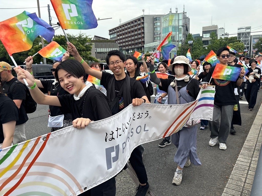 名の社員が、Pride Parade(プライドパレード)へ参加しました。レインボーカラーのパーソルロゴの旗を思い思いに掲げ、沿道からの声にも笑顔で応えながら、「はたらいて、笑おう。」のメッセージを届けました。