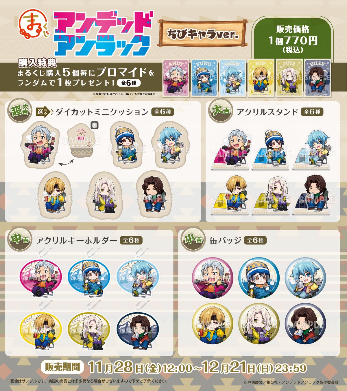 今回のまるくじ『アンデッドアンラック』では「冬のキャンプ」をテーマに「アンディ」、「出雲風子」、「シェン」、「リップ」、「ジュイス」、「ビリー」の新規描き起こしちびキャライラストを使用したオリジナルグッズをご用意しました!
