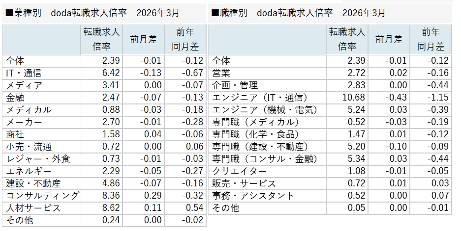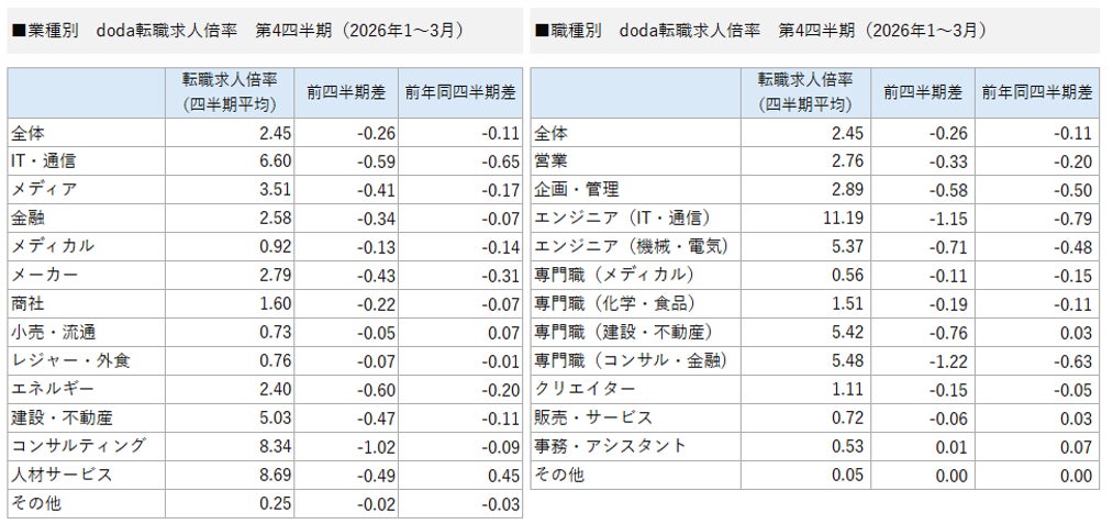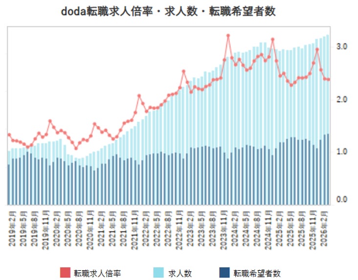 パーソルキャリア株式会社が運営する転職サービス「doda(デューダ)」(編集長:桜井 貴史)は、2026年3月と2025年第4四半期(1~3月)の転職求人倍率をまとめた「doda転職求人倍率」を発表いたします。