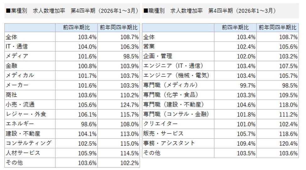 【求人数増加率(業種別・職種別)/2025年 第4四半期(1~3月)】