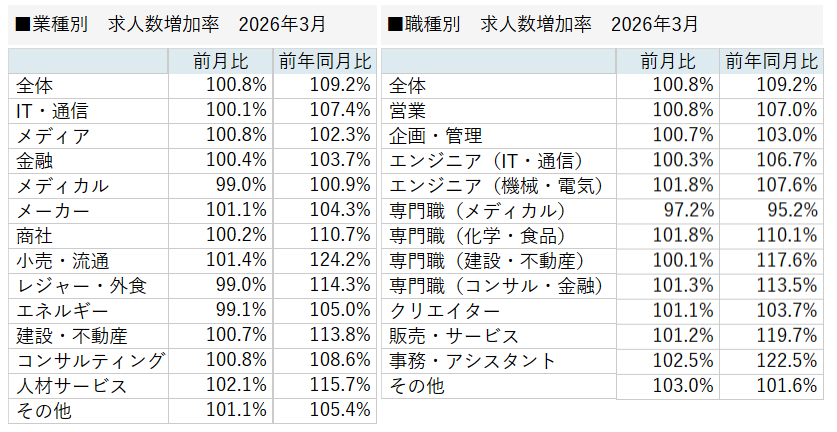 【転職求人倍率(業種別・職種別)/2026年3月】