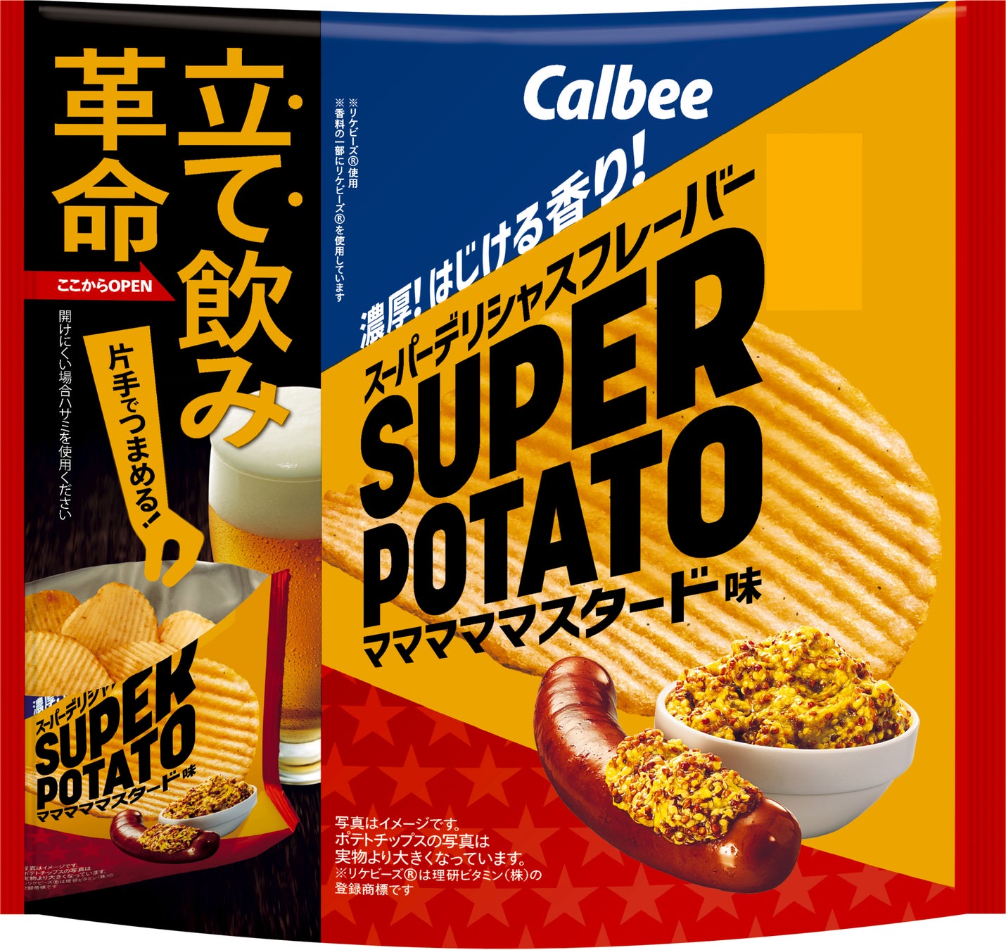 お酒のつまみにぴったりの濃厚ポテトチップス「スーパーポテト」の新フレーバー!マスタードの酸味とジューシーなソーセージの旨みが楽しめる『スーパーポテト マママママスタード味』