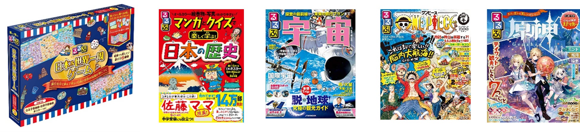 左から『るるぶ日本&世界一周ゲーム』『るるぶマンガとクイズで楽しく学ぶ 日本の歴史』『るるぶ宇宙』『るるぶONE PIECE』『るるぶ原神』