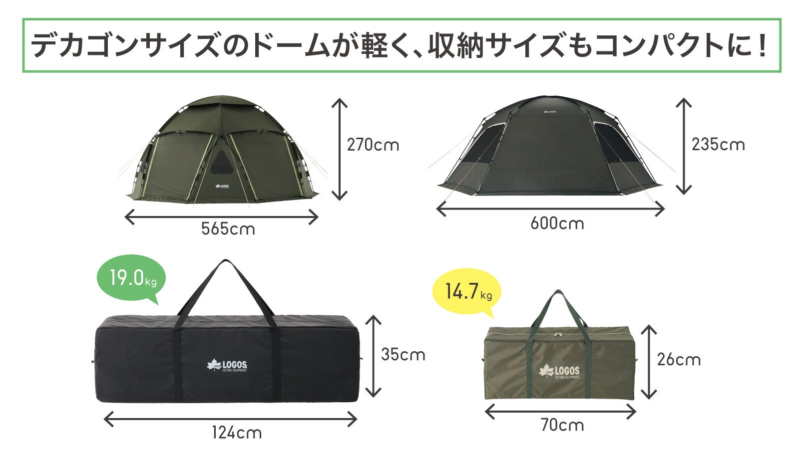 広々空間でありながら、同サイズの大型タープ「デカゴン」よりも4kg以上軽量。収納サイズは2ルームテントと同等のコンパクトさを実現し、車載時や保管時も省スペースでラクラク。