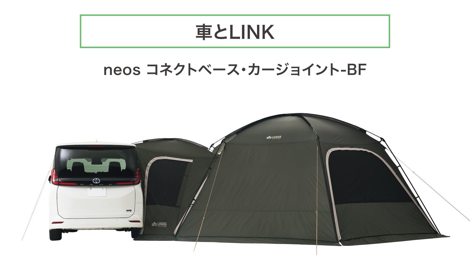 「neos コネクトベース・カージョイント-BF」は、車との連結に対応し、車から直接テント内に入ることができるため、車中泊や雨天時に活躍します。別売りのキャノピーポールを使用すれば、リッジ付きの出入り口としてもご活用いただけます。