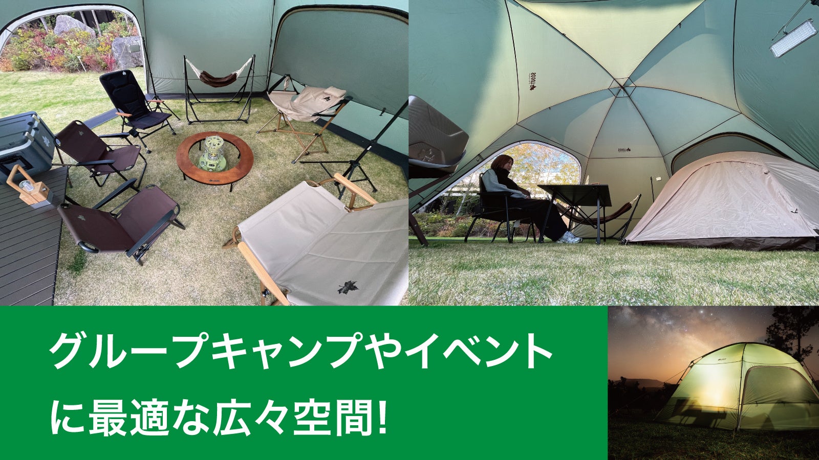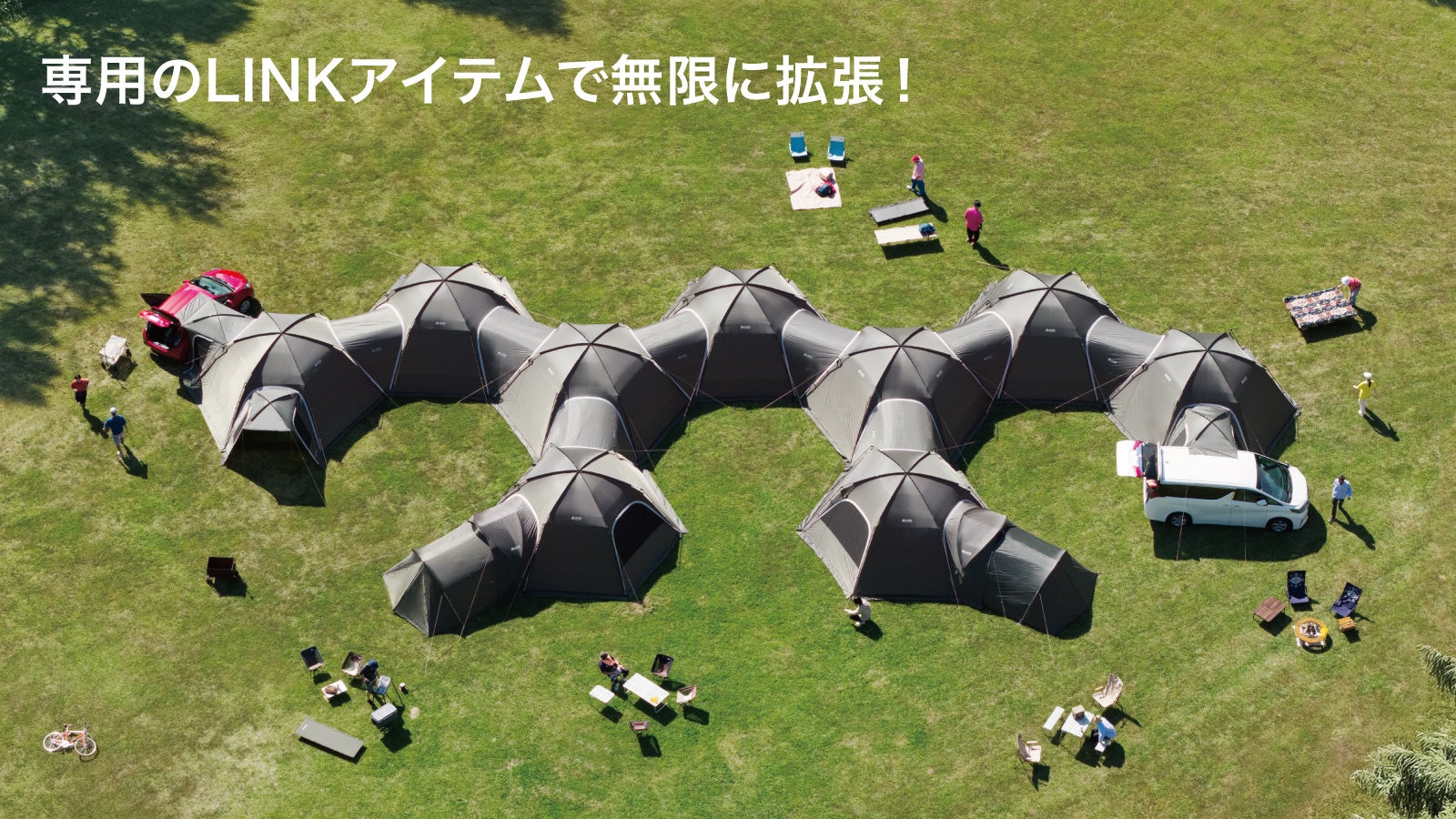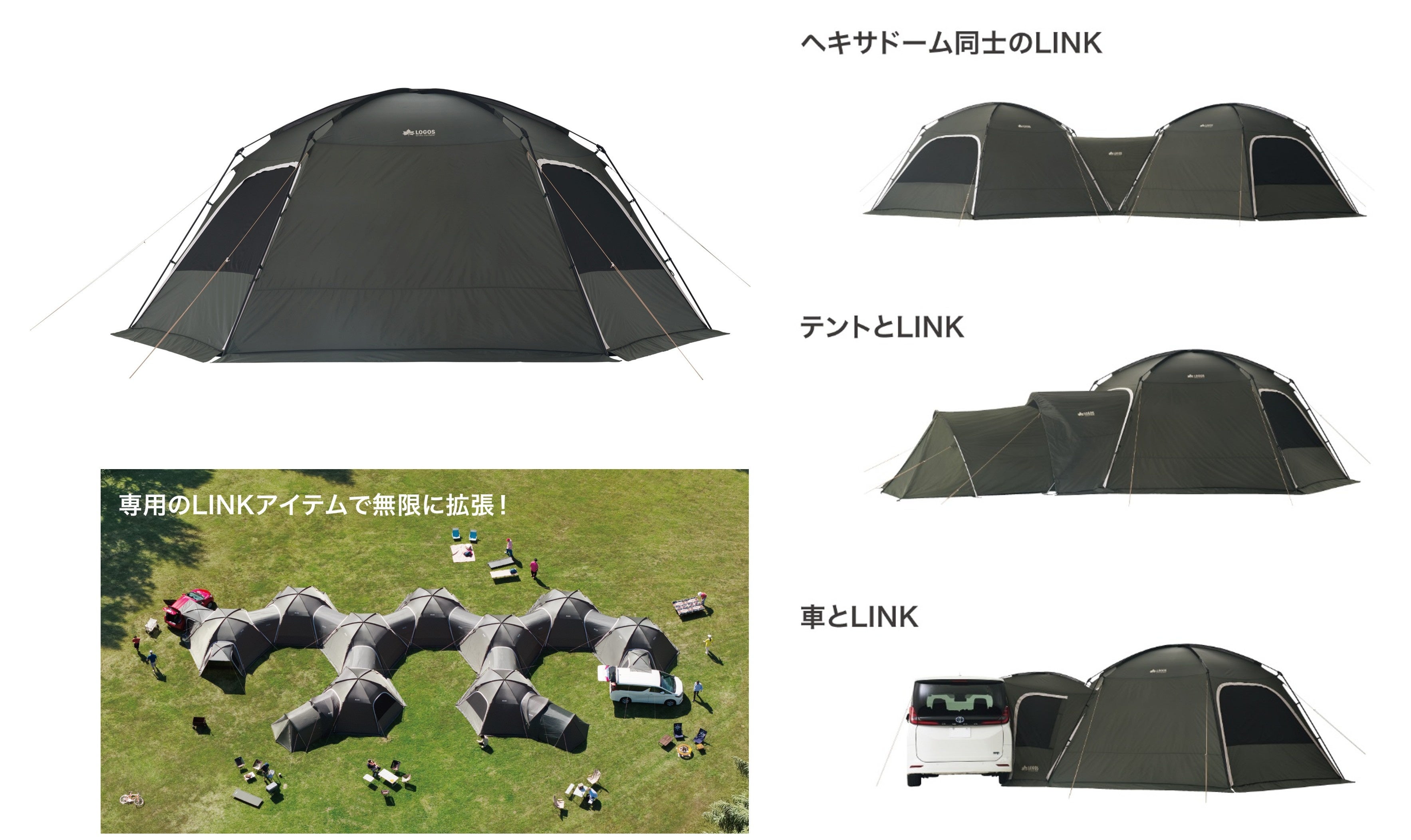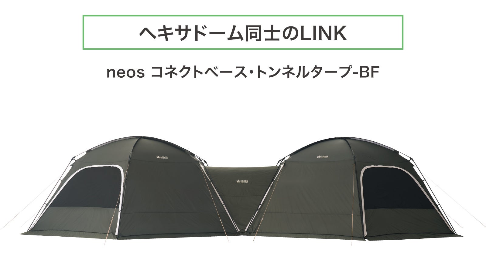 本シリーズは、全長約6mの大型ドームテント「neos コネクトベース・ヘキサドーム 600-BF」をベースに、専用のLINKアイテムを連結することで、無限にプライベート空間を拡張できる「neos コネクトベースシリーズ」です。