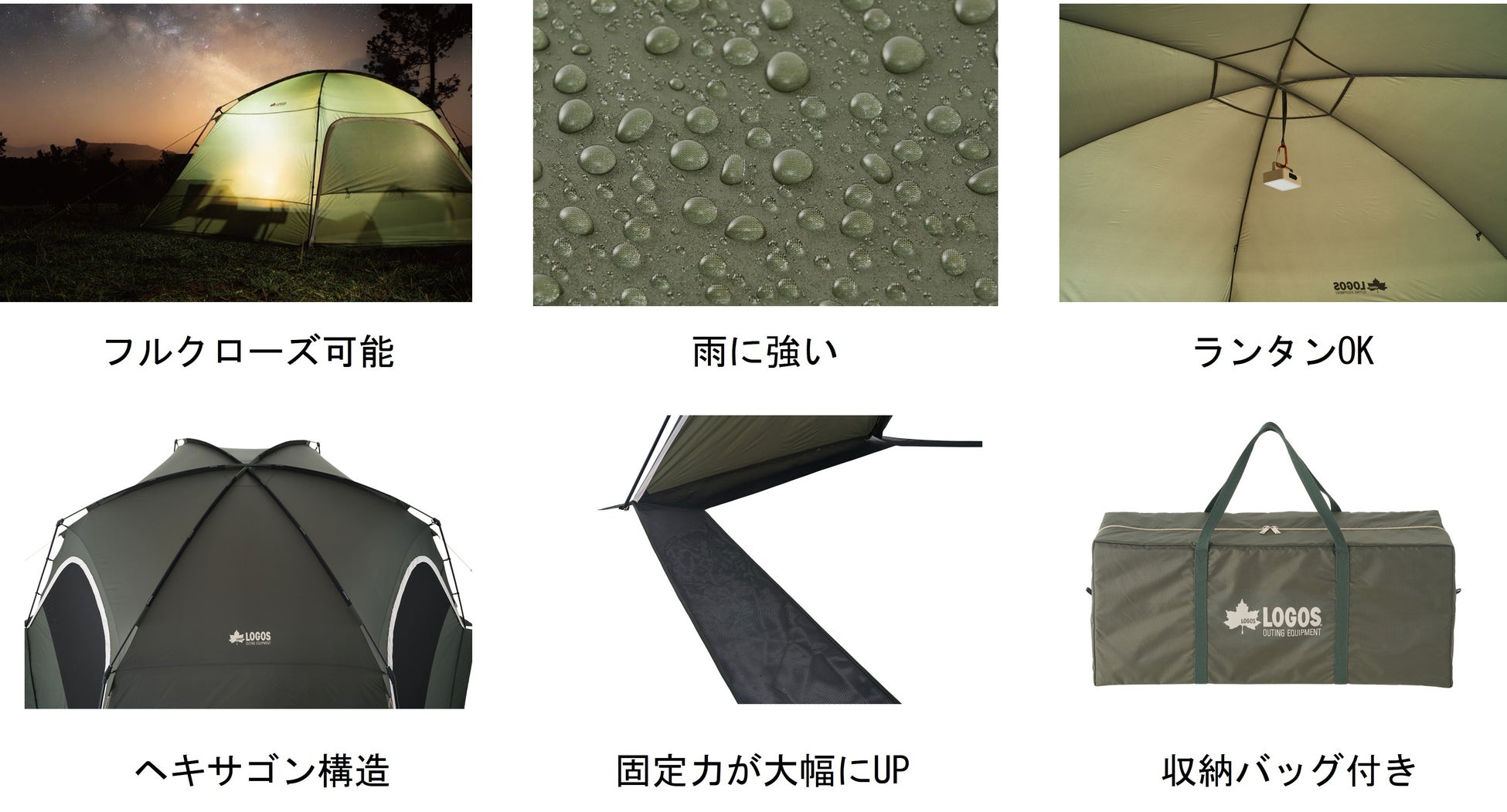 設営・撤収が簡単なうえ、フルクローズ可能でプライベート空間をしっかり確保。居住性・耐風性に優れたヘキサゴン構造かつ、防水・撥水加工で雨天でも安心。さらに、ランタンの吊り下げが可能なループや、雨や虫、冷気の侵入を防ぐマッドスカート仕様など、便利な機能を多数標準装備。