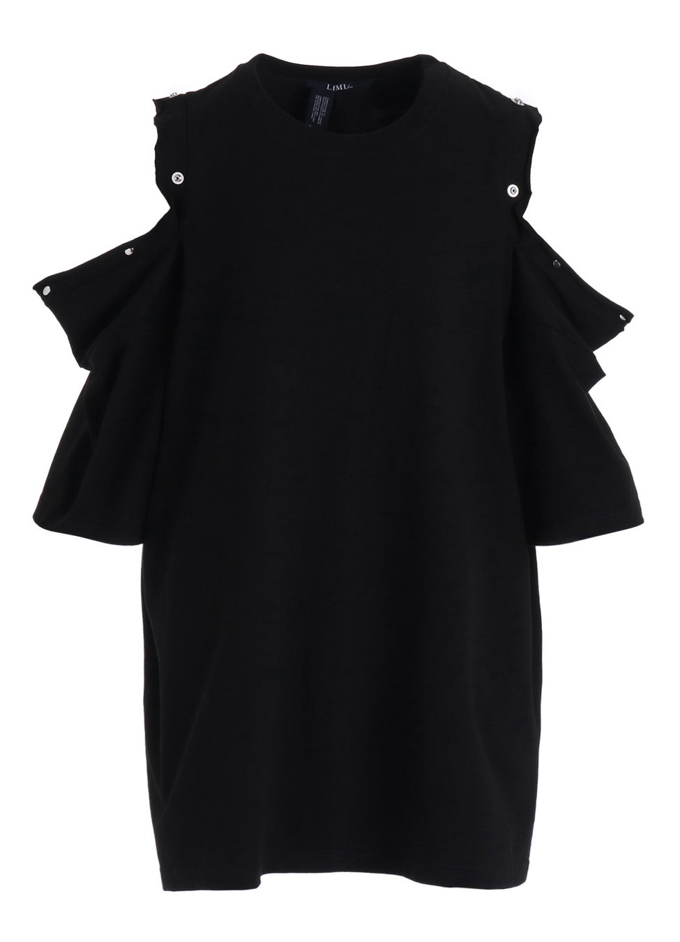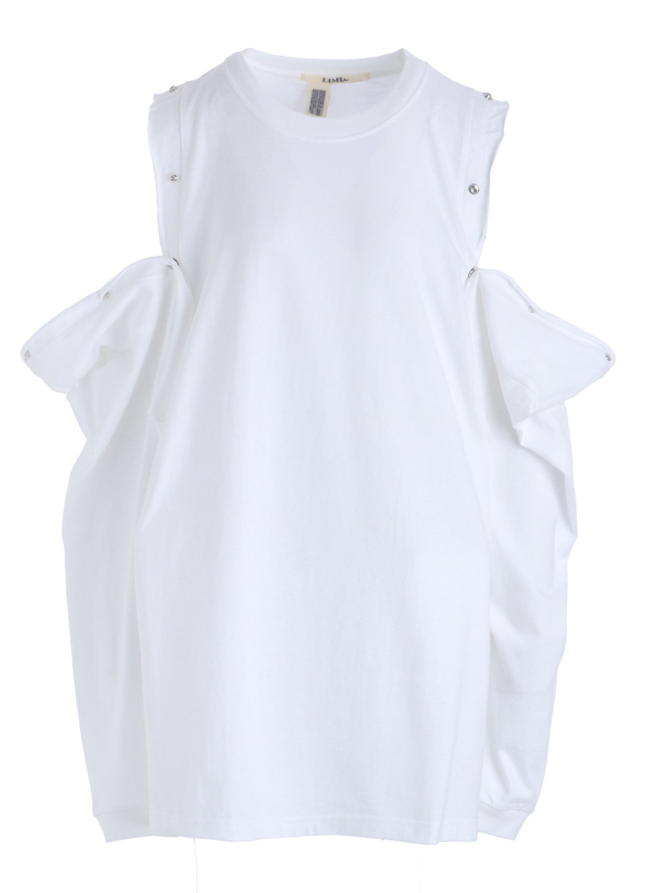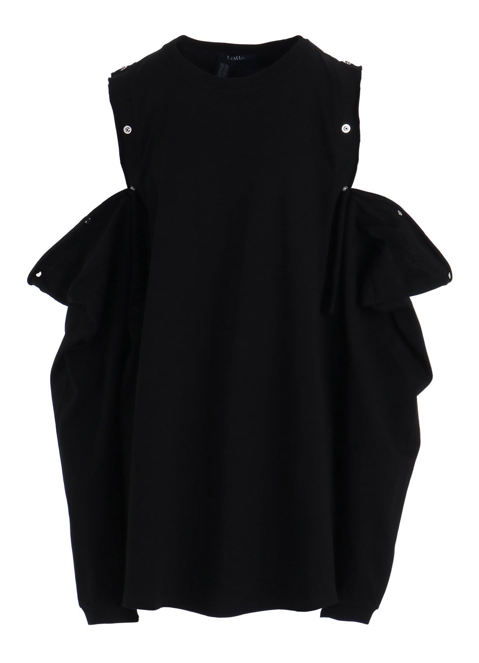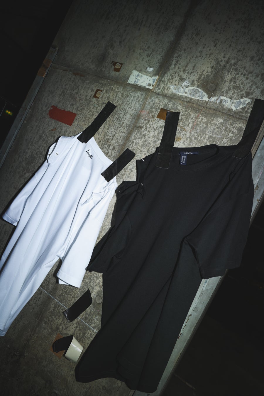 本シリーズでは半袖と長袖2型を、ブラック、ホワイトの2色で展開。いずれも肩に配されたスナップボタンを開閉することで、シルエットやバランスの変化をもたらすデザインが特徴です。