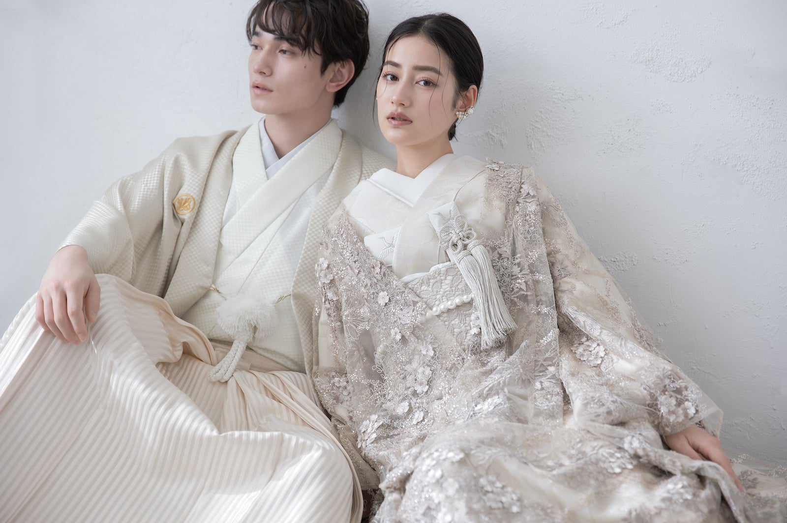 ニュアンスグレージュの繊細な色合いのレース打掛が醸し出す上品な雰囲気を崩しすぎない、同色の色掛下を合わせたシンプルなコーディネートに、aimオリジナルのレース帯や、パールの帯締めなどを合わせ、コーディネートのアクセントとなる小物をセレクト。ご新郎も淡いシャンパンゴールドの袴をセレクトし、ナチュラルな着こなしで世界観に統一感を。