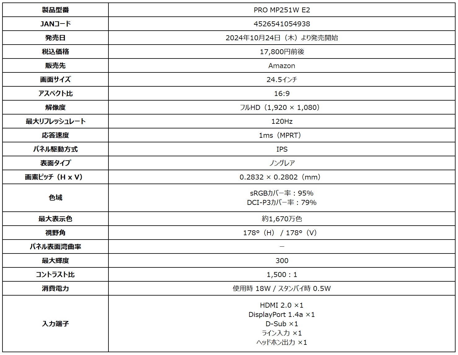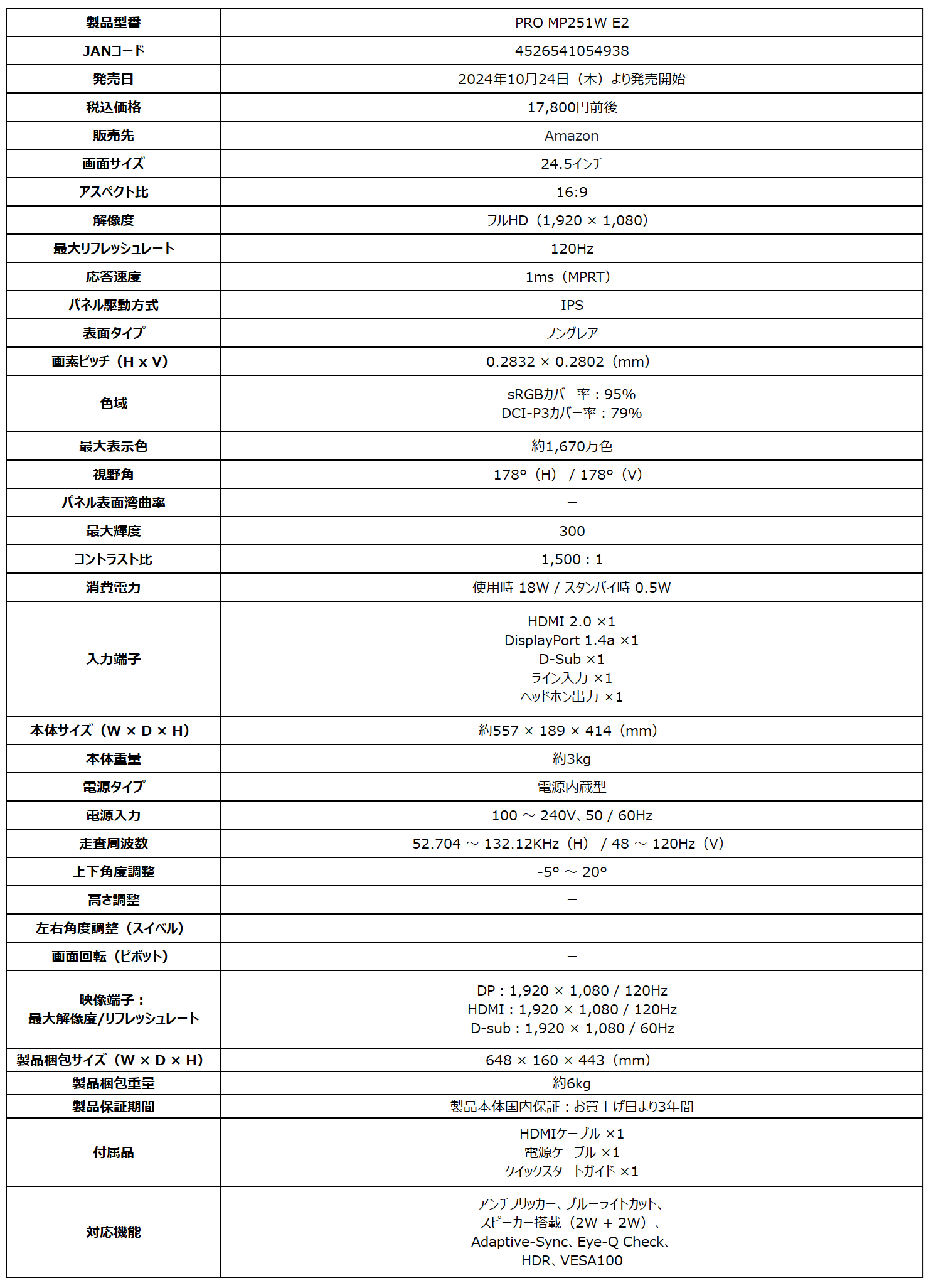 世代を問わずに使用できる目に優しい「EyesErgoモニター」24.5インチ・フルHD・スクロール時も見やすいリフレッシュレート120Hz「PRO MP251W E2」発売