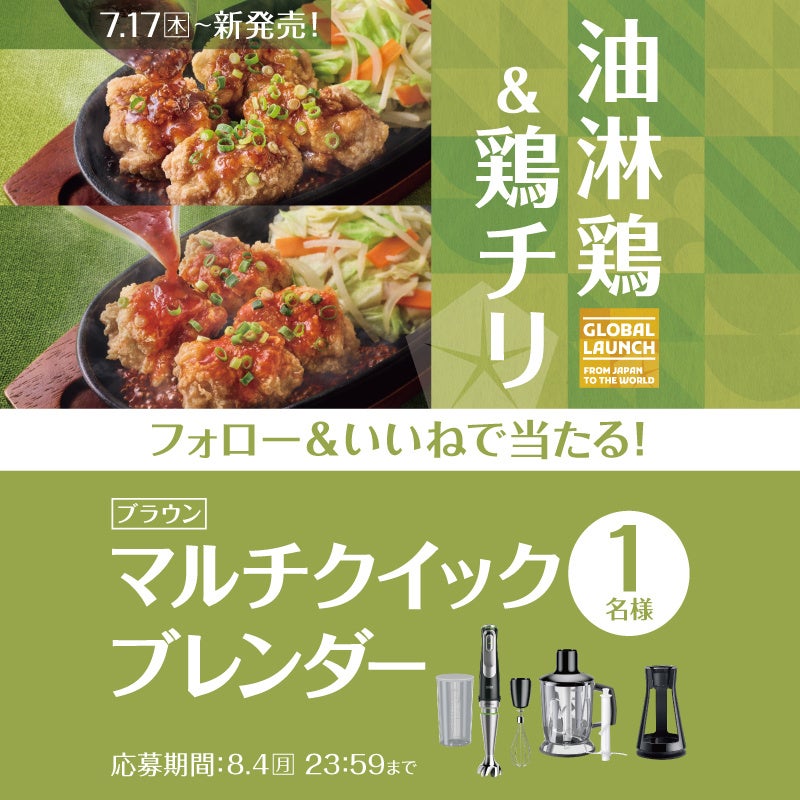 このたび日本国内の「やよい軒」では、やよい軒公式X・公式Instagramにおいて、『鉄板油淋鶏定食・鉄板鶏チリ定食』発売を記念して、Xでは「やよい軒お食事券」、Instagramでは「ブラウン マルチクイックブレンダー」が当たる!キャンペーンを実施いたします。