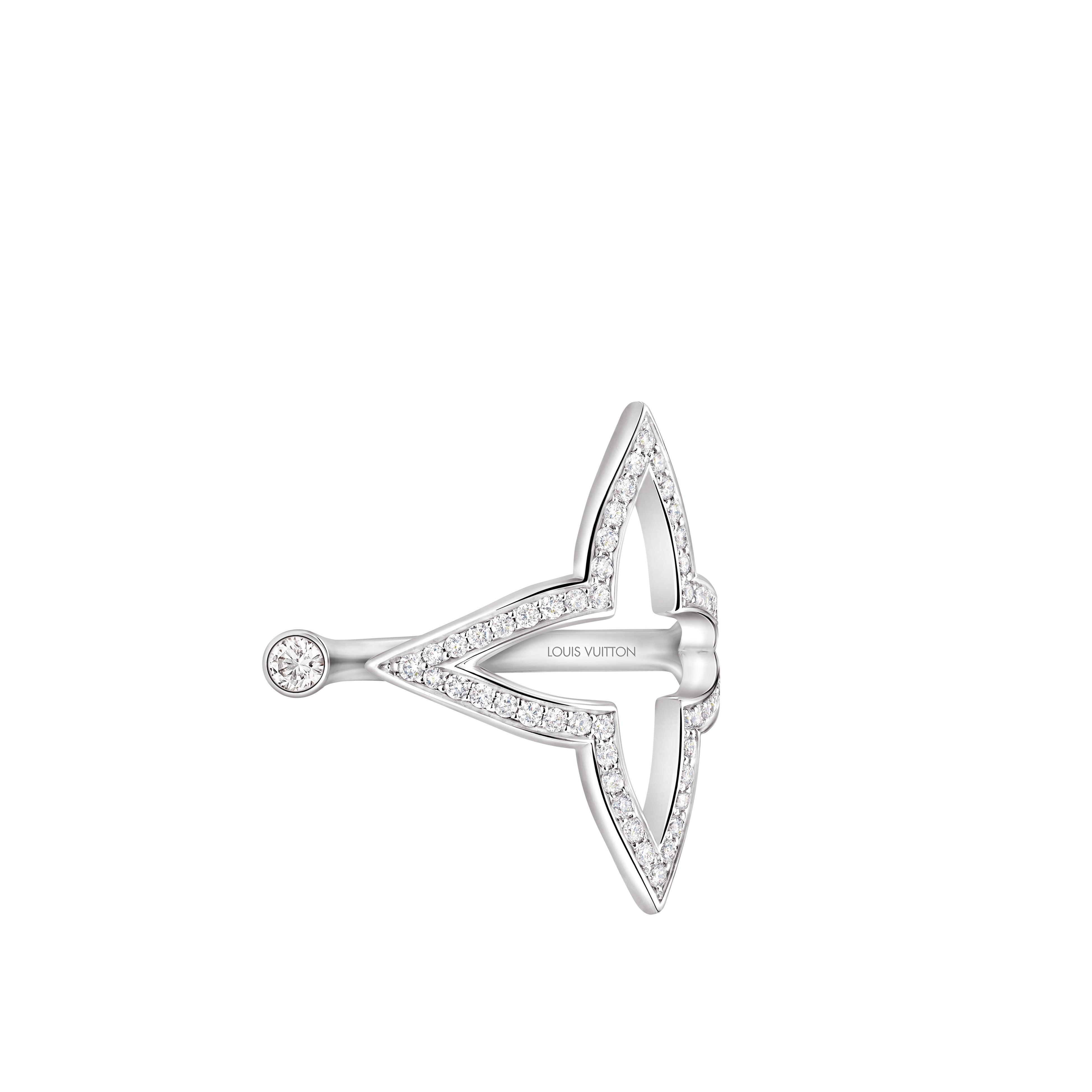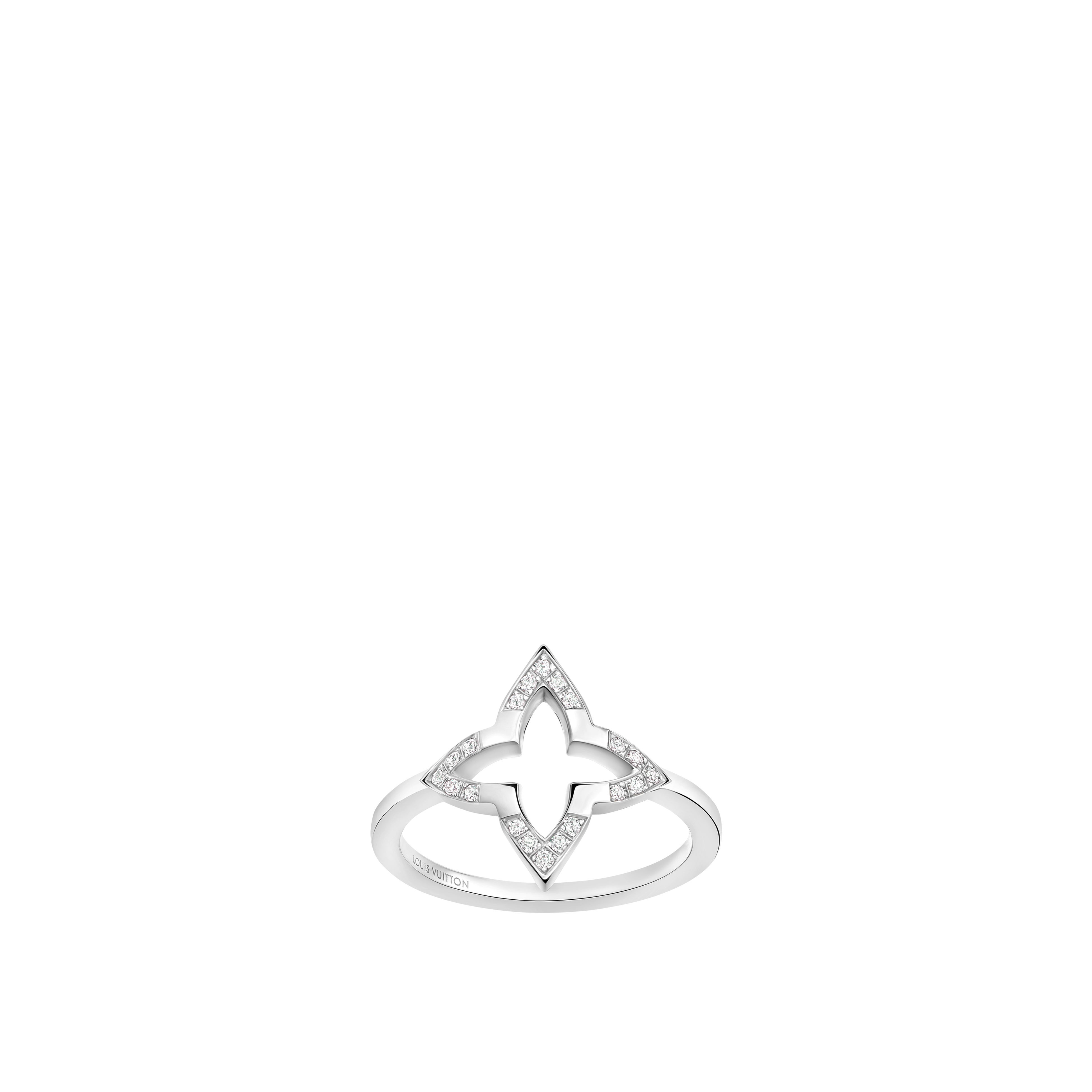 繊細かつ精緻に仕上げた、優美でエレガントなリング「ルイ・ヴィトン ブロッサム」。メゾンのアイコニックなスターシェイプのモノグラム・フラワー モチーフを、艶やかなホワイトゴールドに独特のオープンワーク加工を施して象り、煌めくダイヤモンドをあしらいました。単体ではもちろん、「ブロッサム コレクション」の他のアイテムと重ね着けしてもお楽しみいただける、この上なくフェミニンでプレシャスなリングです。