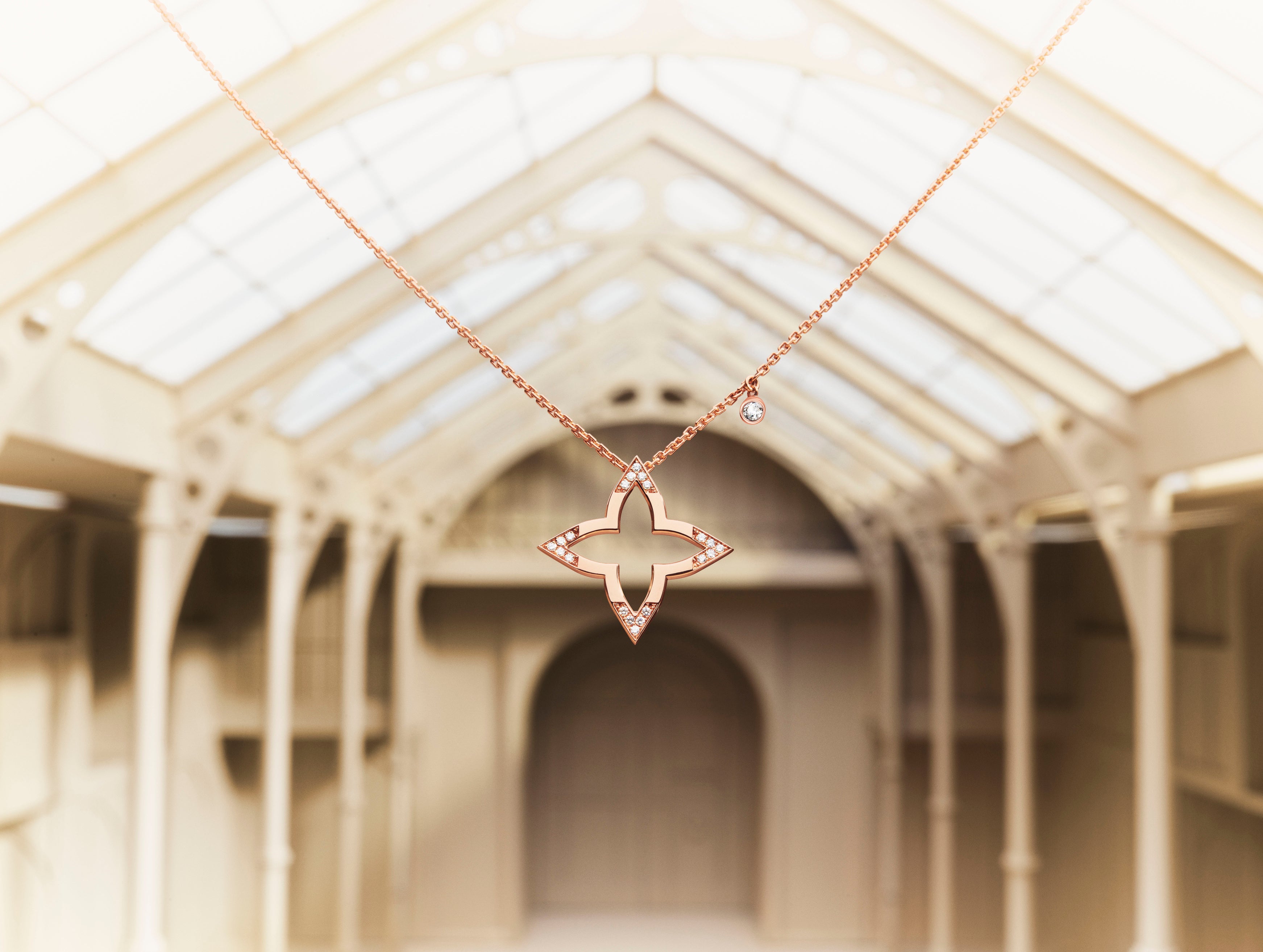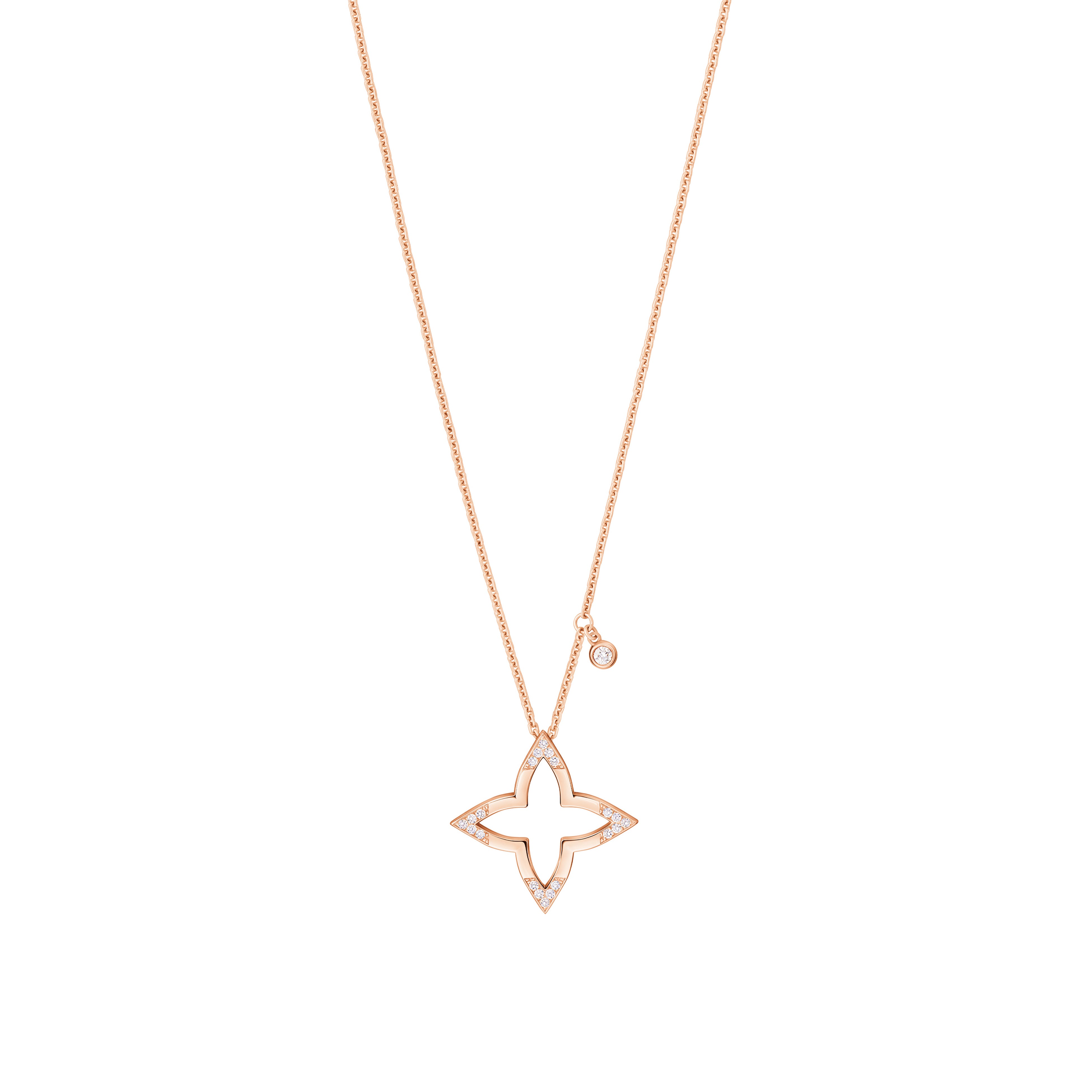 オープンワーク加工を施したグラフィカルなデザインが目を引くペンダント「ルイ・ヴィトン ブロッサム」。ルイ・ヴィトン伝統のスターシェイプのモノグラム・フラワー モチーフをピンクゴールドの繊細なアウトラインで象り、先端には煌めくダイヤモンドをあしらいました。チャームのようなアクセントダイヤモンドが、フェミニンで上品な魅力をプラス。永遠に咲き誇るアイコニックなフラワー・モチーフを讃える、プレシャスなアイテムです。