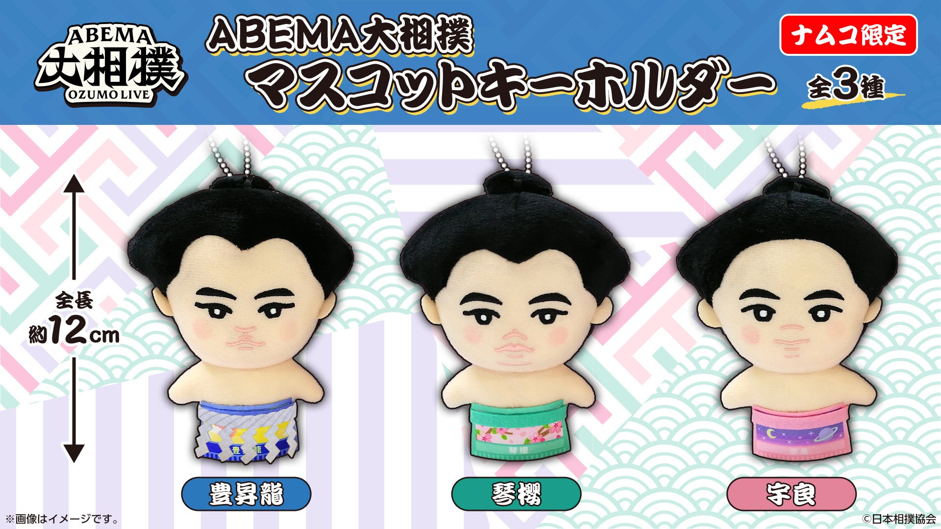 今回、ナムコオンラインクレーンにて登場する『ABEMA大相撲』の限定プライズは、横綱・豊昇龍関、大関・琴櫻関、と前頭4枚目(※2)・宇良関の全3種となります。角界の人気力士がオリジナルの廻しデザインで再現し登場。ナムコでしか手に入れることができない貴重な『ABEMA大相撲』の限定グッズを、ぜひ「ナムコ」および「ナムコオンラインクレーン」でゲットしてください。