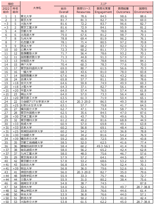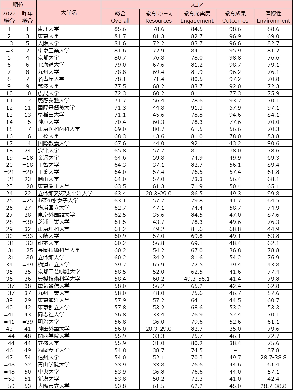 THE世界大学ランキング日本版2022【総合順位】(50位まで抜粋)