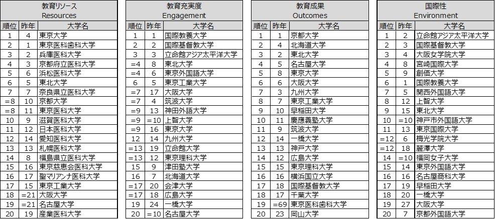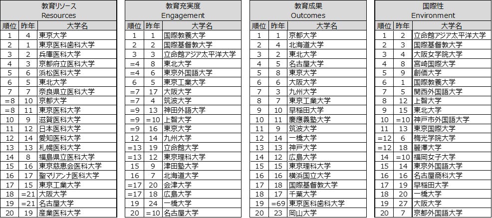 また、分野別ランキングでは、「教育リソース」で東京大学が再び1位となり、「教育充実度」は国際教養大学、「教育成果」は京都大学と、昨年から変化はなく、「国際性」では立命館アジア太平洋大学が初めて1位になりました。(ランキング詳細については、次ページ以降をご覧ください)
