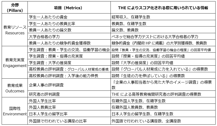 2022年版のランキング指標は、2021年版から変更はありません。2019年版以来、指標における「教育充実度」の充実を図る目的で、“教員・学生の交流、協働学習の機会”、“授業・指導の充実度”、“大学の推奨度”の3つの学生調査の結果が、重要な指標項目としてランキングに反映されています。