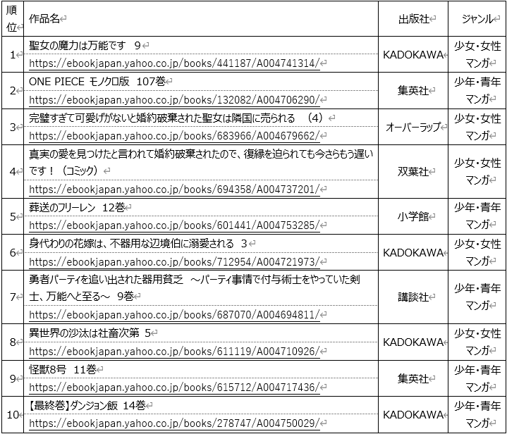 12月30日(土)、ebookjapanで誰でも40%OFF!月間人気作品ランキングも掲載!(2023/12/20時点)~第1位は『聖女の魔力は万能です』(KADOKAWA)~