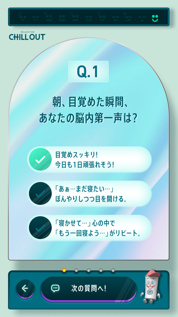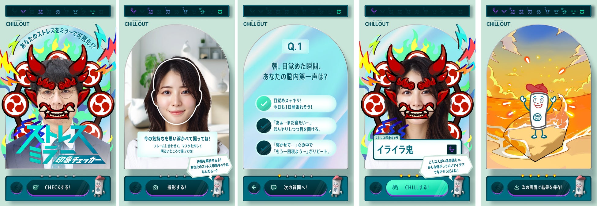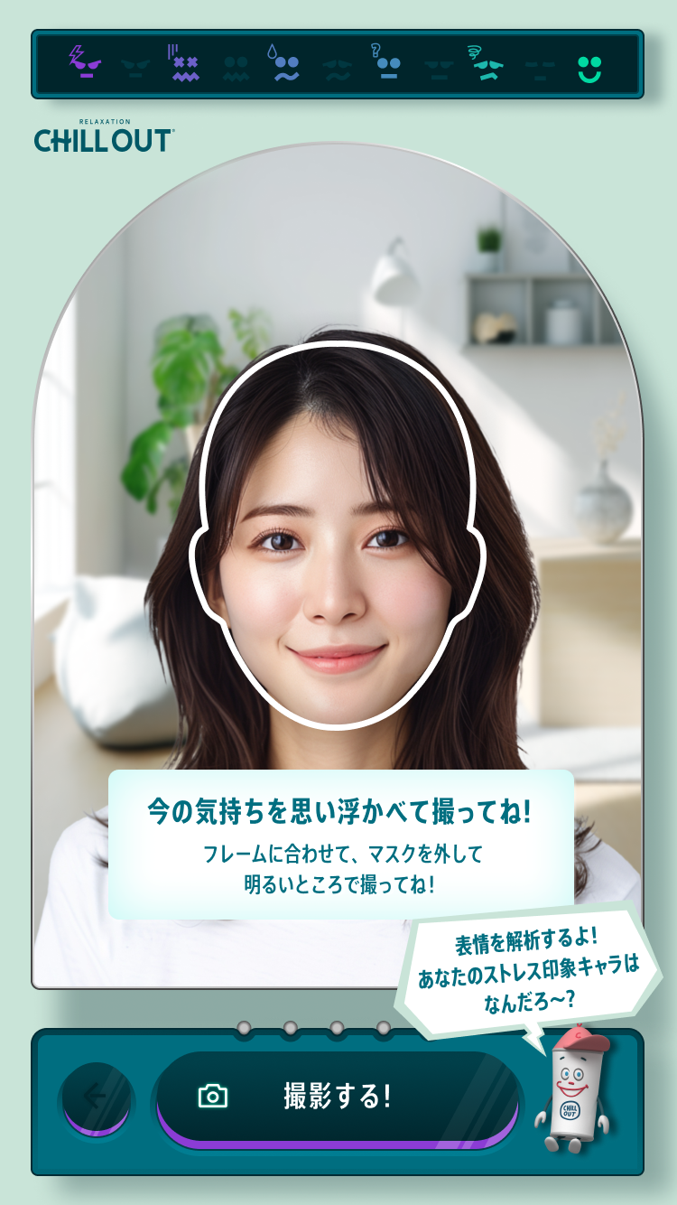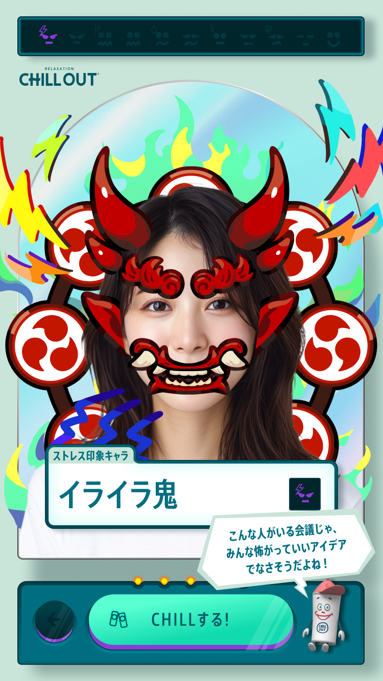 これからの季節は気候も安定せず、メンタル面で不調になる人が多くなる時期です。メンタルケアに大事なことは、まず自分の感情やストレスがどうなっているかを自分自身で理解すること。今回のCHILL OUTのストレスミラー印象チェッカーでは、表情と設問から自分の状況をユーモラスに知ることができます。自分が思っているよりもストレスや疲労感が溜まっていることもあるので、まずは気軽にチェックして、自分を見つめる時間をつくることもよいかもしれませんね。