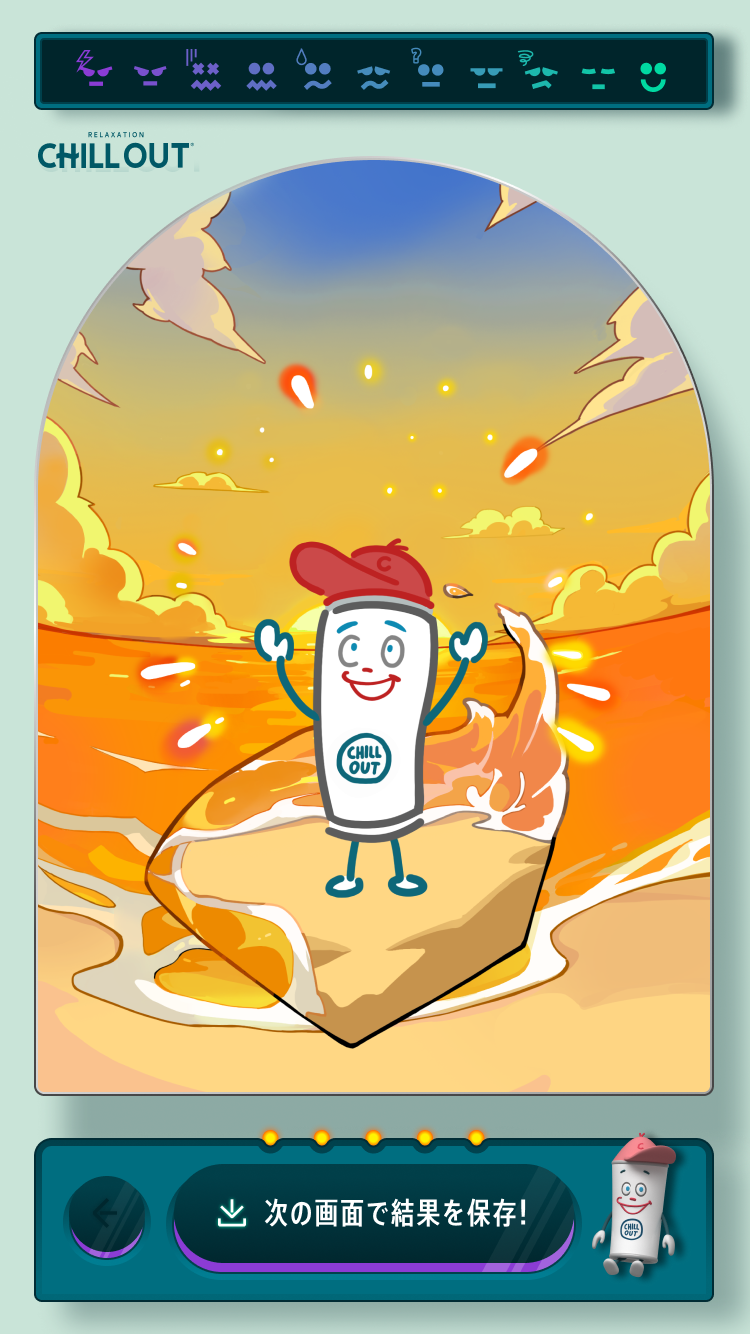 自分のストレスタイプを表現した13種類の「ストレス印象キャラ」に自分の顔が合成された画像をダウンロードできます。ハッピーに過ごしている人は、超レアキャラ「パーフェクトチル君」が出ることも。