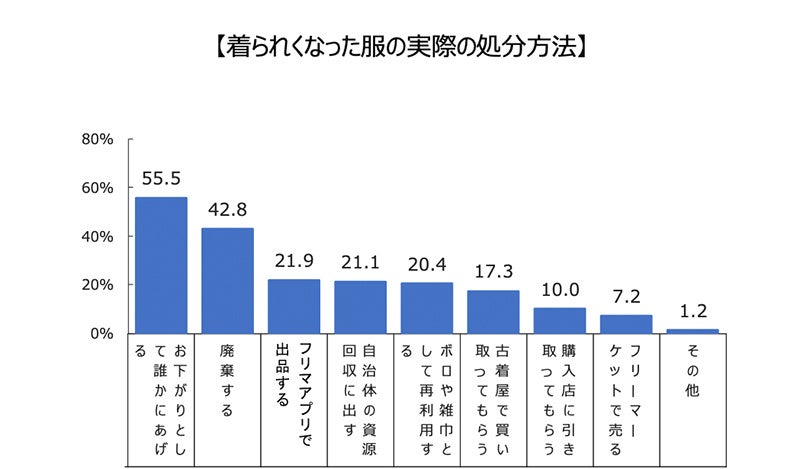 一般的に、キッズ製品は子供の成長によって約2年でサイズアウトすると言われています。当社では、20~50代の男女約1,200名にアンケートを実施し、キッズ製品の処分方法について調査を行いました。その結果、最も多かったのは『お下がりとして誰かにあげる』でしたが、次に多かったのが『廃棄する』という事が分かりました。(※1)この結果に鑑み、ゴミとして廃棄される服を削減し、そこに新たな価値を付加して販売するリセール事業を開始します。本事業は、製品のロングライフ化やお客様との深く長い繋がりを築くとともに、循環型社会を実現するための一環であるファッションロス・ゼロを目指すことを目的としています。