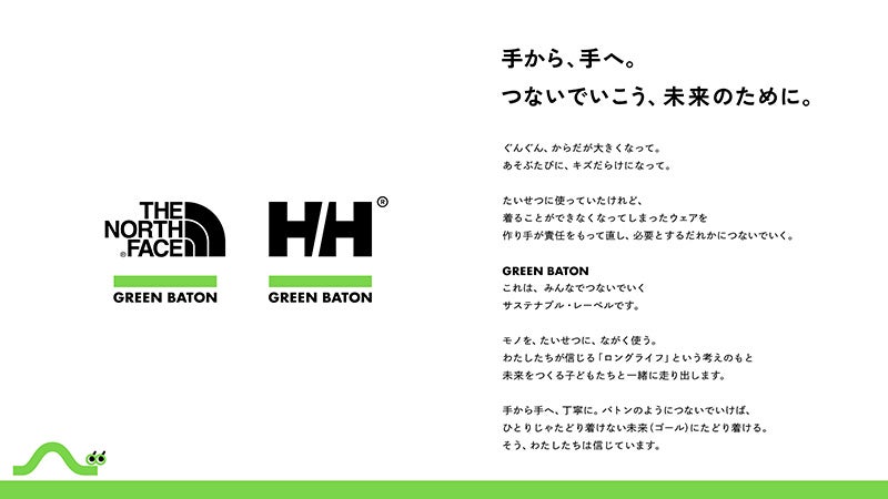 株式会社ゴールドウイン(本社:東京都渋谷区、代表取締役社長:渡辺貴生)は、アパレルの廃棄を減らし、ファッションロス・ゼロを目指すためのリセール事業である、サステナブル・レーベル「GREEN BATON(グリーン・バトン)」を始動します。スタート時は、当社が展開する「THE NORTH FACE(ザ・ノース・フェイス)」と「HELLY HANSEN(ヘリーハンセン)」のキッズ製品を対象に、7月21日(木)より全国の直営店対象15店舗にて、当社直営店舗で使用可能なクーポン券による買取りを開始します。