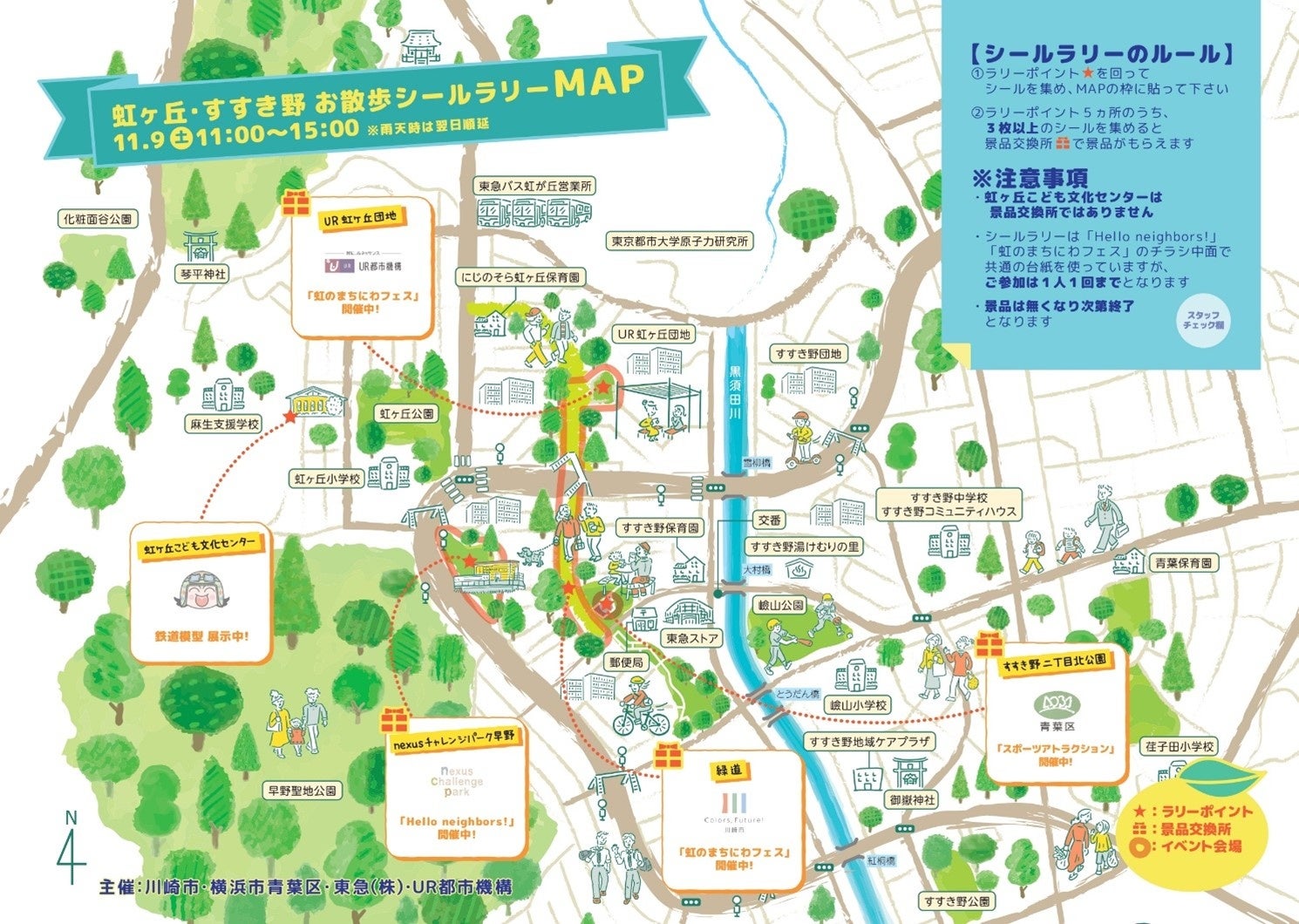 これらのイベントに併せて、川崎市、横浜市青葉区、UR都市機構、東急株式会社の4者の連携によるシールラリー企画を実施し、各イベントを楽しみながら虹ヶ丘・すすき野エリア全体の回遊性の向上を図ります。