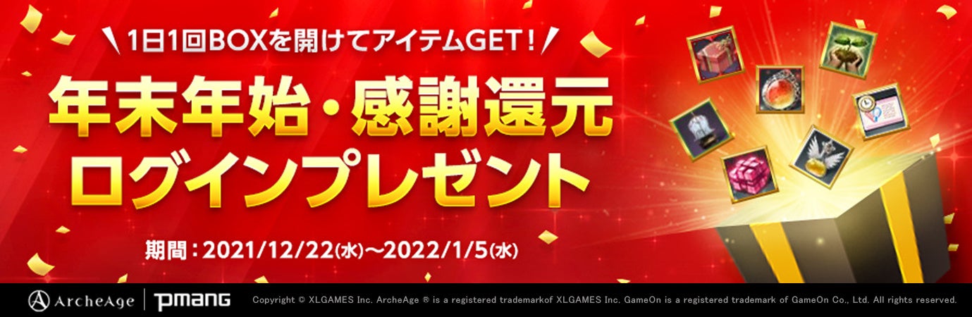 株式会社ゲームオン[本社:東京都渋谷区、代表取締役社長:李 相燁(イ サンヨプ)] は、超大型MMORPG『ArcheAge(アーキエイジ)』において、2021年12月22日(水)より、冒険に役立つアイテムが毎日手に入る「年末年始・感謝還元ログインプレゼント」を開始いたしました。