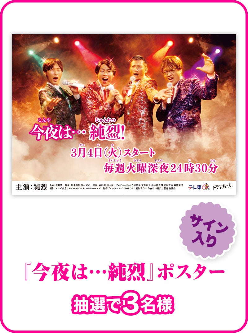 応募方法 :①対象店舗のデンモクで「ドラマ『今夜は…純烈』コラボキャンペーン」バナーを