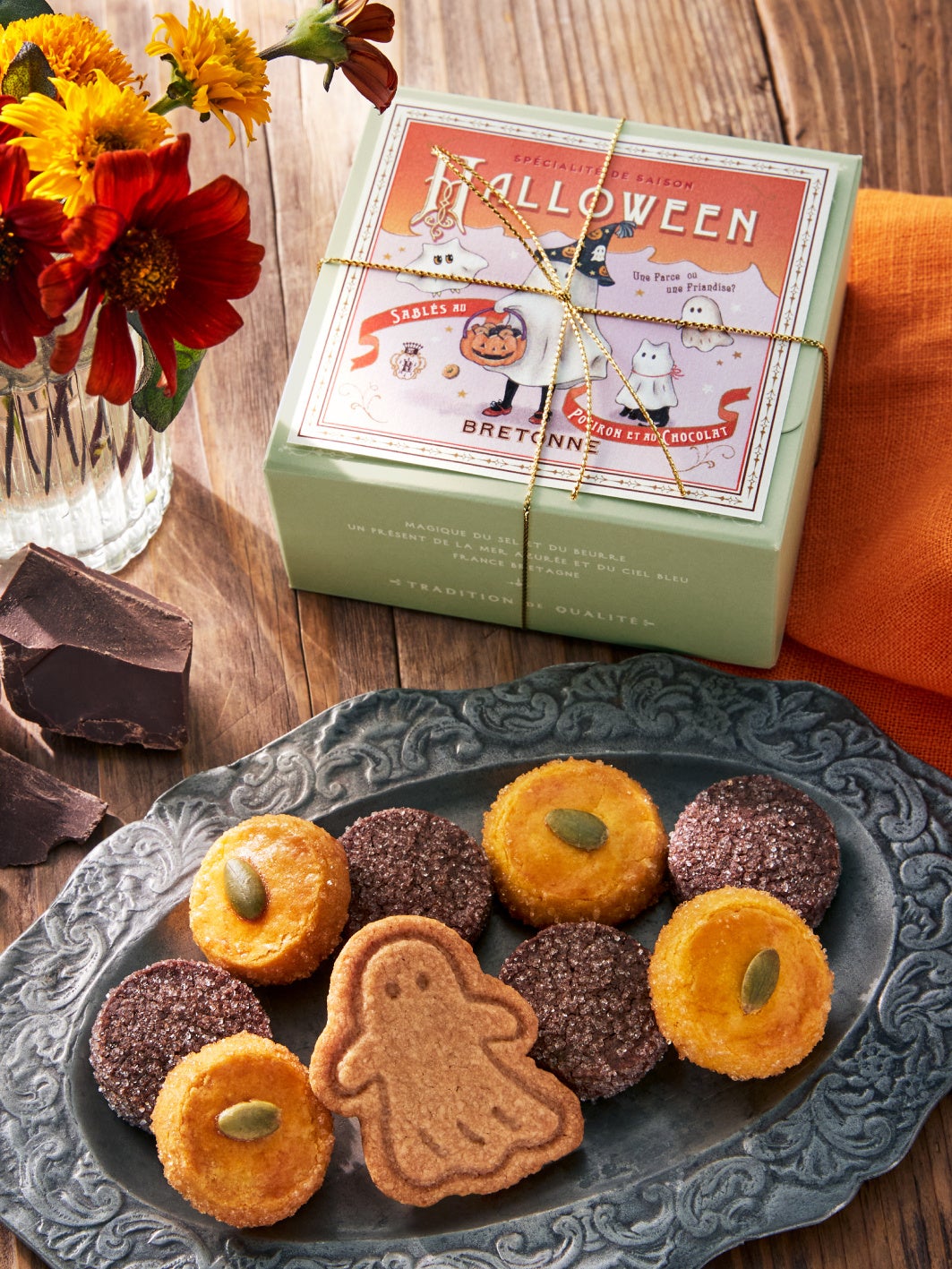 スパイスがほのかに香るおばけの形が可愛いクッキー「おばけ」、かぼちゃのやさしい甘味が広がる「かぼちゃのサブレ」、ショコラのほろ苦さにザラメ糖の甘味がアクセントの「サブレ・ショコラ」の3種のクッキーを詰め合わせたハロウィン限定のサブレ小箱です。おばけに仮装した魔女の女の子や仲間たちの可愛いイラストを添えた小箱に入れてラッピングしました。