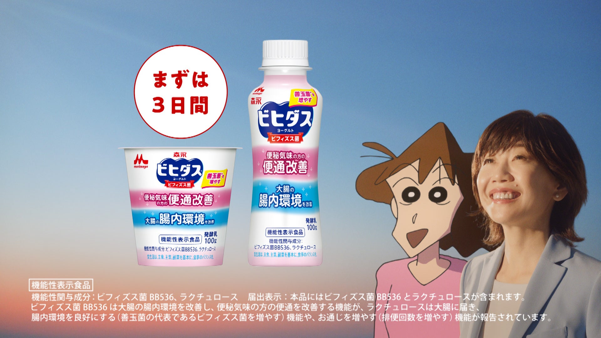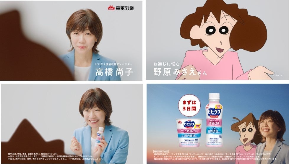 発売から毎年伸長を続ける※1「ビヒダス ヨーグルト 便通改善」シリーズ アンバサダー高橋尚子さんに加え、お通じに悩まされ続ける国民的お母さん“野原みさえ”さんを起用した新TVCMを全国で放映開始