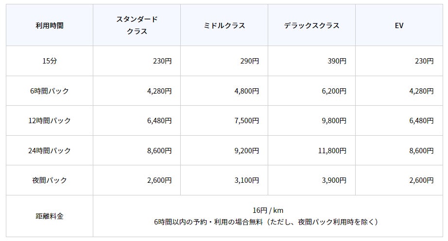 ・利用料金には、対人・対物・車両補償等の保険料が含まれます。また、利用中トラブルの多くを占める7項目(事故におけるノンオペレーションチャージ、タイヤパンク、鍵のインロック、利用中のバッテリー上がりに伴う現地ジャンピング費用、事故等のレッカー対応、ガス欠での現地給油、事故・故障時の代車費用)については、費用が無償となります(ただし、一部保険・補償が適用できない場合がございます)。