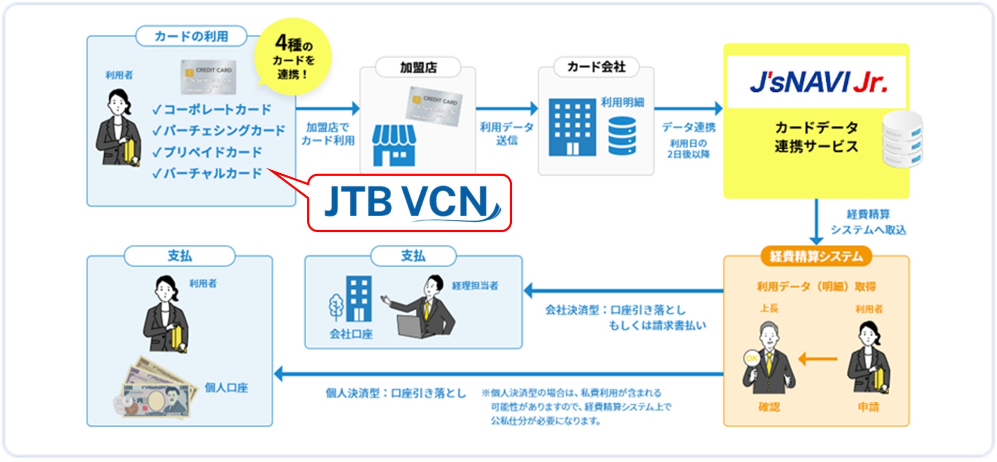 今回のデータ連携開始により、JTBが発行しJBIが運用するJTB-VCNの利用明細データを、JTB-CWTが提供する経費データ連携プラットフォーム「J’sNAVI Jr. (ジェイズナビジュニア)」(※2)を経由して、同カードの導入企業が利用中のワークフロー・経費精算システムに連携することが可能となります。