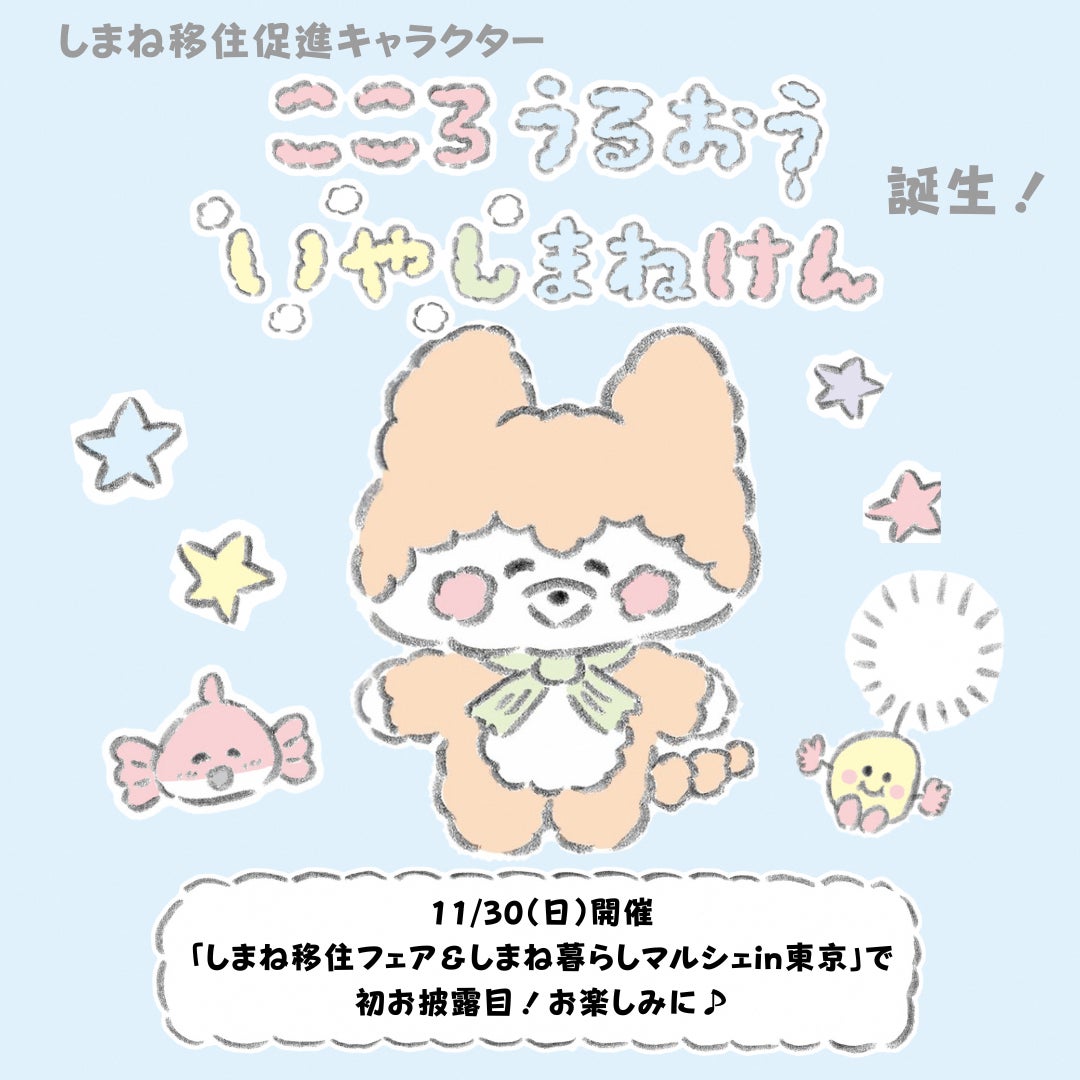また、11/30(日)東京開催のイベント、「しまね移住フェア&しまね暮らしマルシェ」にていやしまねちゃんの初お披露目となります。作者である、えちがわのりゆきさんのトークショーや、いやしまねちゃん紹介ブースで一緒に写真撮影も可能です。皆さまのご来場をお待ちしております。