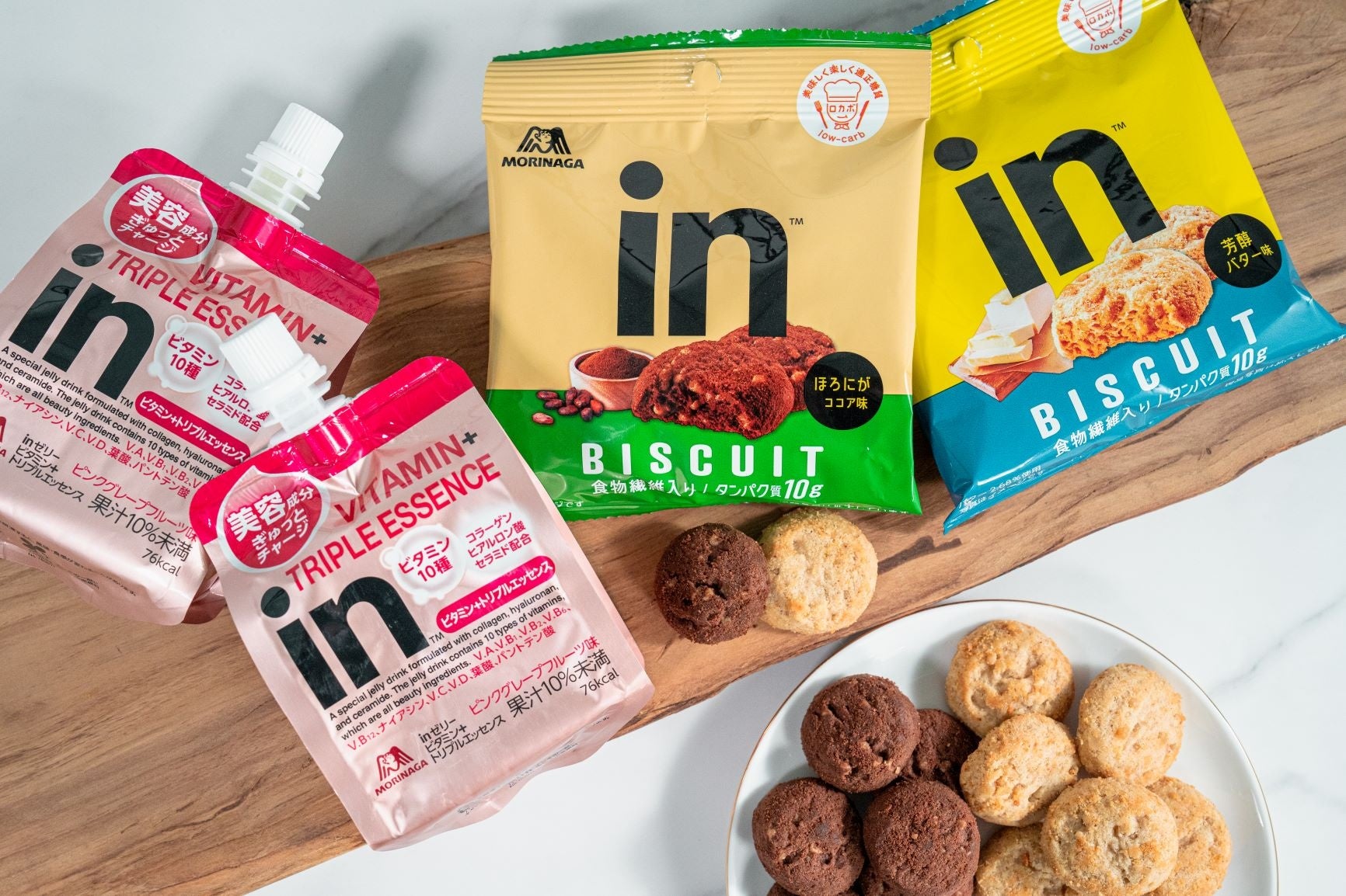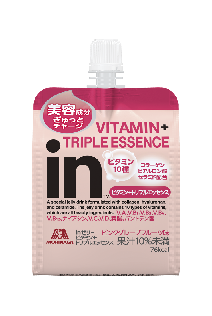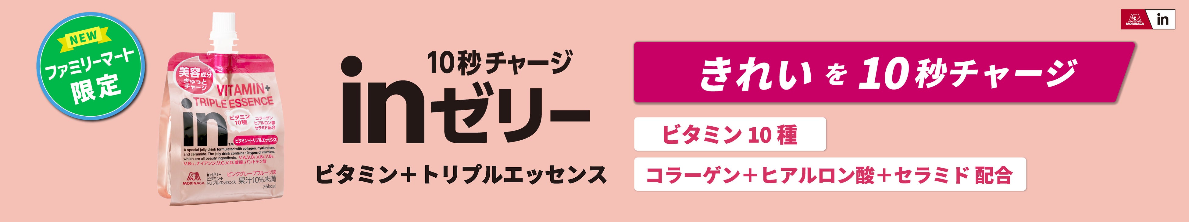 このたび、ファミリーマート限定商品として「inゼリー ビタミン+ トリプルエッセンス」と「inビスケット 芳醇バター」、「inビスケット ほろにがココア」を発売いたします。ゼリーは忙しい毎日でも健康や美容に気をつけたいというニーズに着目。ビタミン10種にプラスし、inゼリーで初めて、コラーゲン・ヒアルロン酸・セラミドの3種をまとめて配合しました。ビスケットはおやつや間食のシーンにおいて手軽においしくタンパク質を摂取できるようそれぞれ開発いたしました。