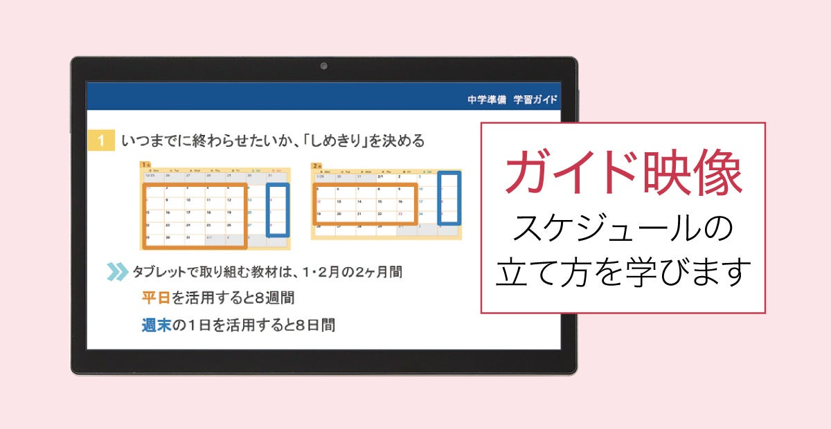 学び方の「ガイド映像」で、スケジュールの立て方を具体的にレクチャーします。「中学準備ステージ」での計画立てが、「しめきり」を決め、「何を」「どのくらい」やるのか確認し、スケジュールに割り振るトレーニングになります。