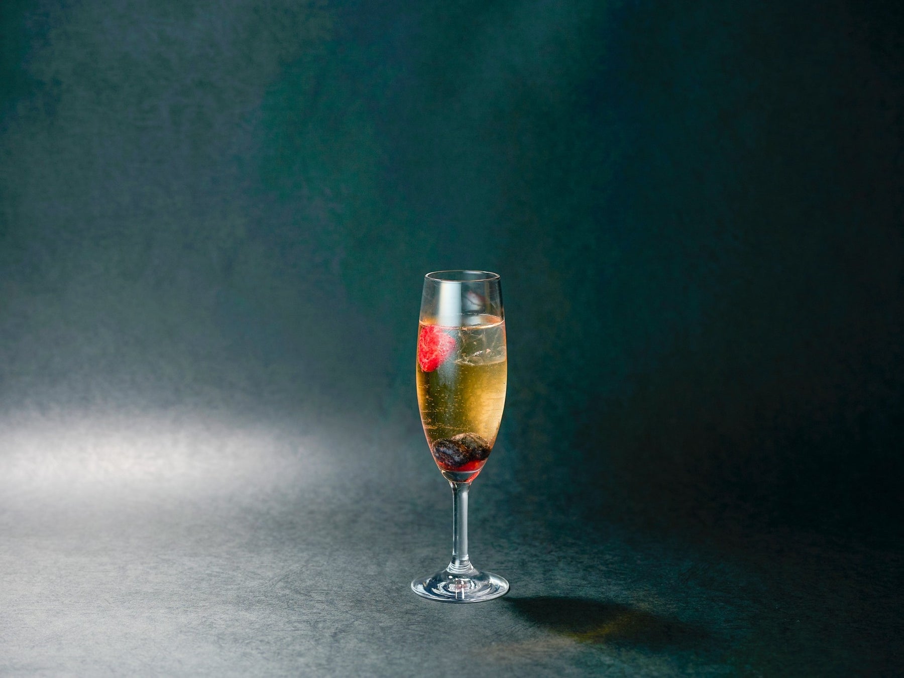 木苺の甘い実を象徴する「愛情」、ブルーベリーの「思いやり」「好意」。その花言葉に寄せて、ノンアルコール白ワインと洋ナシシロップでベリーの甘酸っぱさを引き立てました