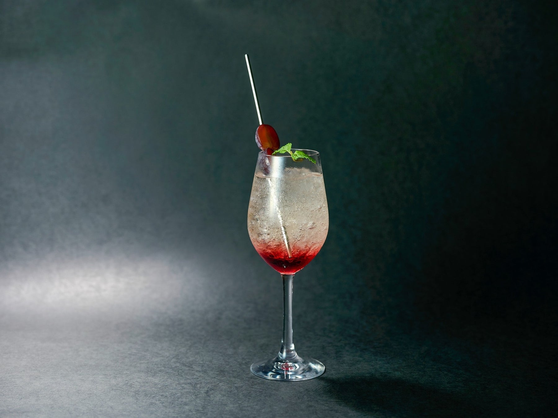 甘酸っぱいカシスシロップとシュワシュワスパークリングがときめく秋のカクテル♡ピオーネとミントを添えて、見た目も味もキュートに仕上げました。ノンアルコールで楽しめる、大人かわいい 1杯です