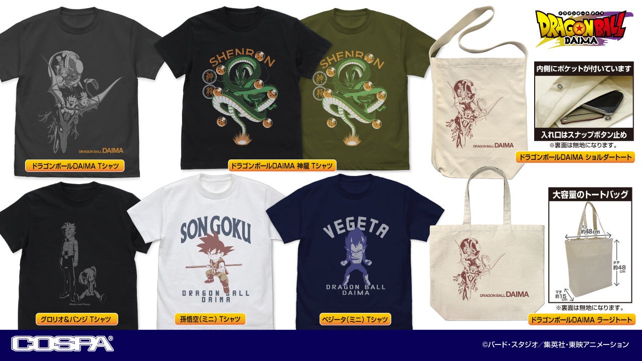 『ドラゴンボールDAIMA』より、「孫悟空(ミニ)」「ベジータ(ミニ)」「神龍」たちのTシャツやトートバッグなどがCOSPA(コスパ)から登場。